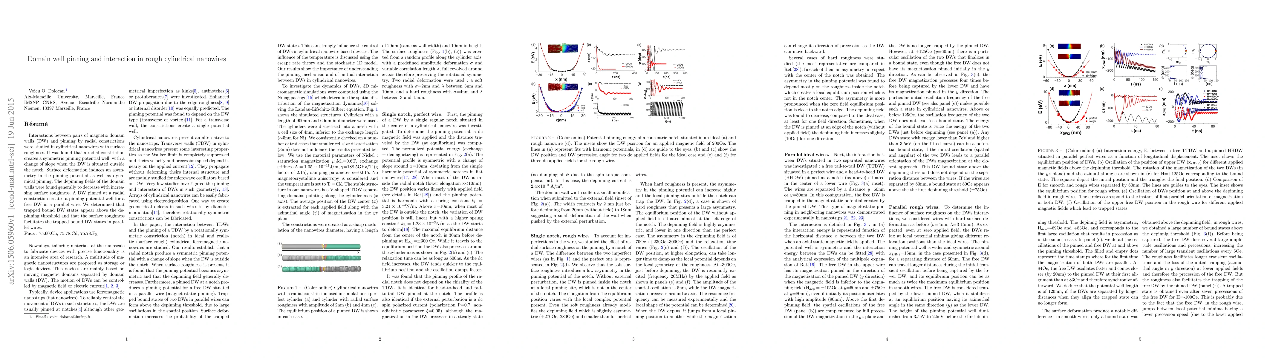 Interactions between pairs of magnetic domain walls (DW) and pinning by radial constrictions were studied in cylindrical nanowires with surface roughness. It was found that a radial constriction creates a symmetric pinning potential well, with a change of slope when the DW is situated outside the notch. Surface deformation induces an asymmetry in the pinning potential as well as dynamical pinning. The depinning fields of the domain walls were found generally to decrease with increasing surface roughness. A DW pinned at a radial constriction creates a pinning potential well for a free DW in a parallel wire. We determined that trapped bound DW states appear above the depinning threshold and that the surface roughness facilitates the trapped bound DW states in parallel wires.