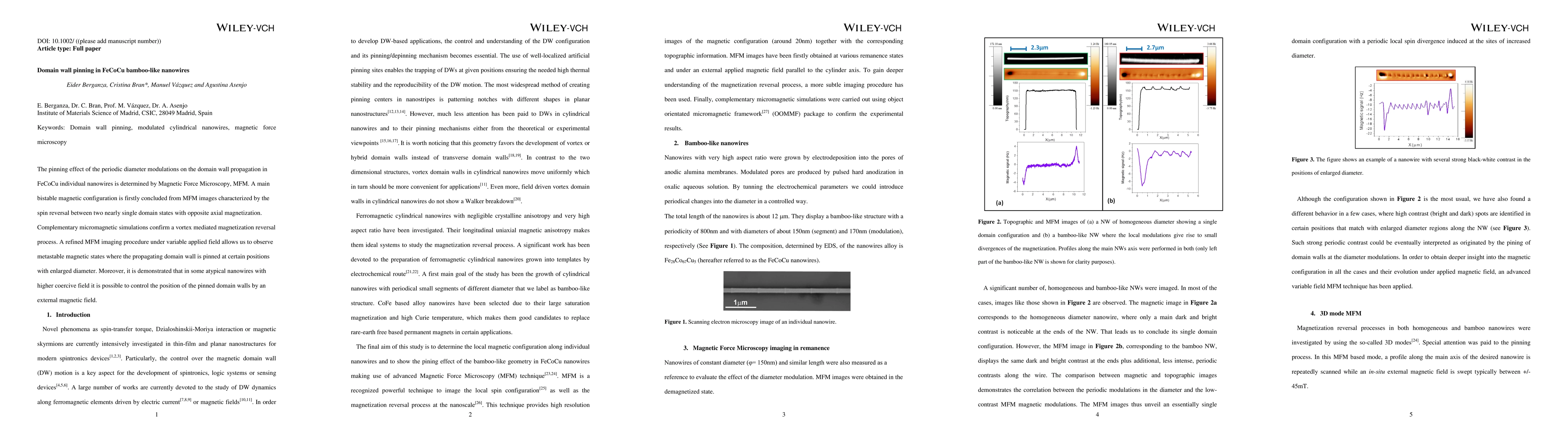 This study investigates the domain wall pinning in FeCoCu bamboo-like nanowires using Magnetic Force Microscopy (MFM) and micromagnetic simulations, revealing bistable configurations and vortex-mediated reversal processes. The research demonstrates control over pinned domain wall positions via external magnetic fields in certain high coercive field nanowires.