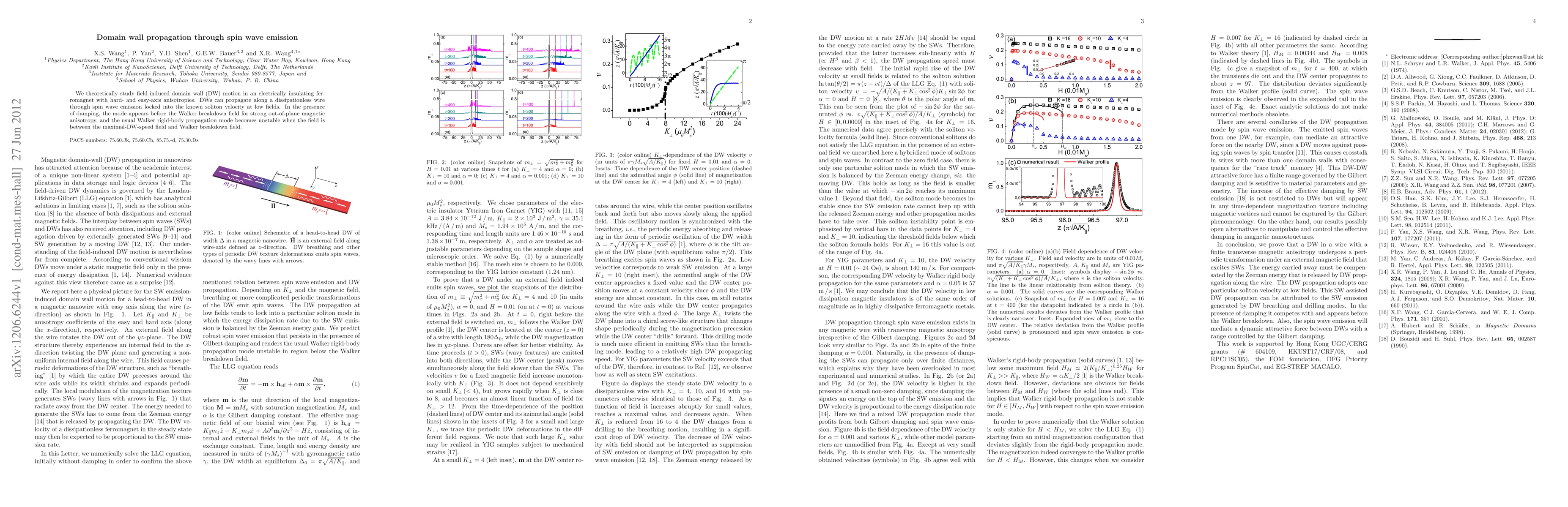 This paper investigates theoretically how domain walls in an insulating ferromagnet can move via spin wave emission under an applied field. It finds that domain walls can propagate through spin wave emission at low fields, becoming unstable at higher fields due to damping effects.