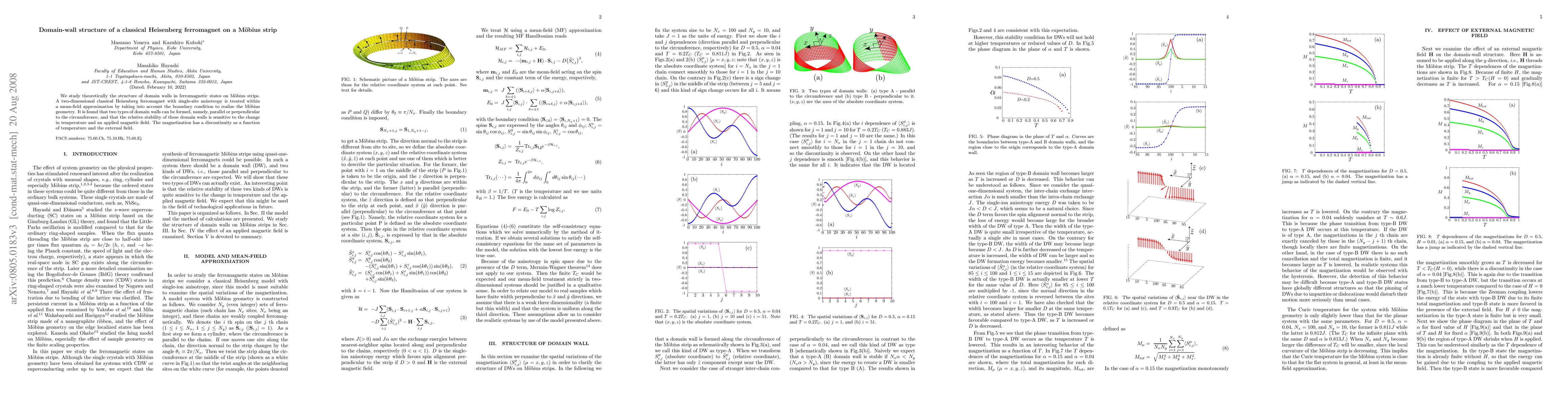 We study theoretically the structure of domain walls in ferromagnetic states on Mobius strips. A two-dimensional classical Heisenberg ferromagnet with single-site anisotropy is treated within a mean-field approximation by taking into account the boundary condition to realize the Mobius geometry. It is found that two types of domain walls can be formed, namely, parallel or perpendicular to the circumference, and that the relative stability of these domain walls is sensitive to the change in temperature and an applied magnetic field. The magnetization has a discontinuity as a function of temperature and the external field.