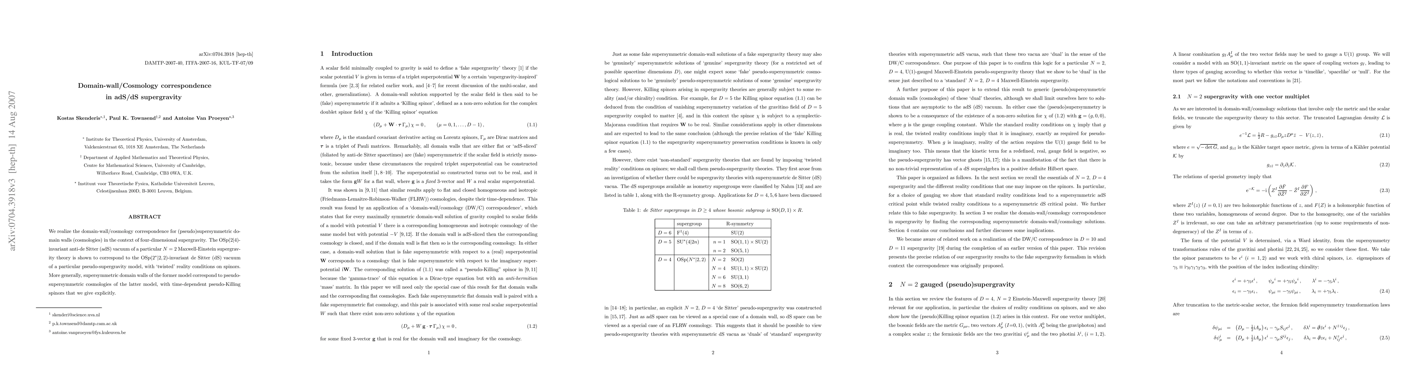 This paper establishes a domain-wall/cosmology correspondence in four-dimensional supergravity, demonstrating the equivalence between an OSp(2|4)-invariant anti-de Sitter vacuum and an OSp(2^*|2,2)-invariant de Sitter vacuum through a pseudo-supergravity model with modified spinor conditions. It also explicitly provides time-dependent pseudo-Killing spinors for the correspondence.
