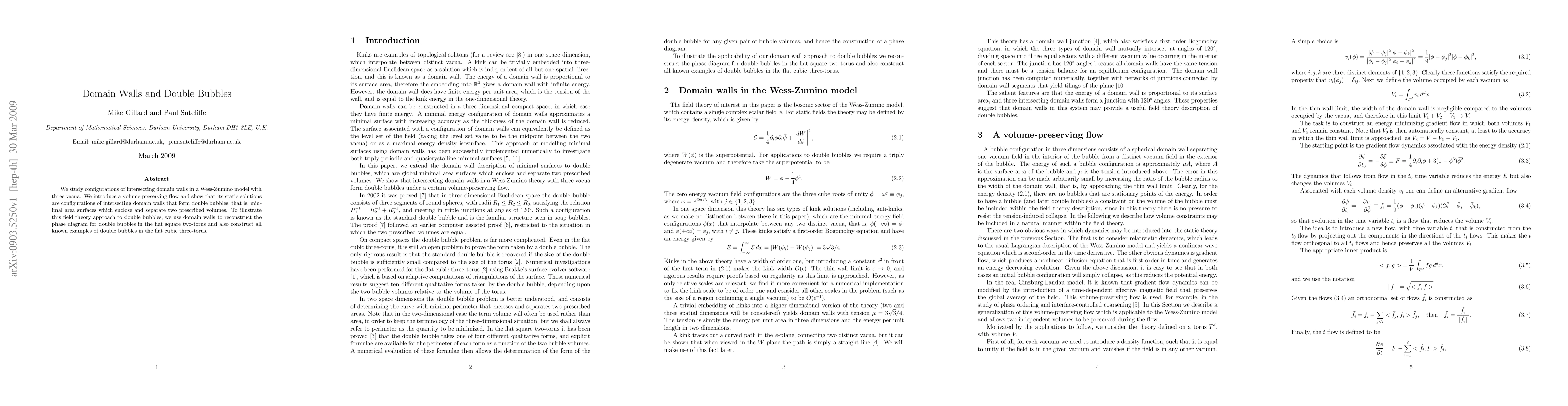 We study configurations of intersecting domain walls in a Wess-Zumino model with three vacua. We introduce a volume-preserving flow and show that its static solutions are configurations of intersecting domain walls that form double bubbles, that is, minimal area surfaces which enclose and separate two prescribed volumes. To illustrate this field theory approach to double bubbles, we use domain walls to reconstruct the phase diagram for double bubbles in the flat square two-torus and also construct all known examples of double bubbles in the flat cubic three-torus.
