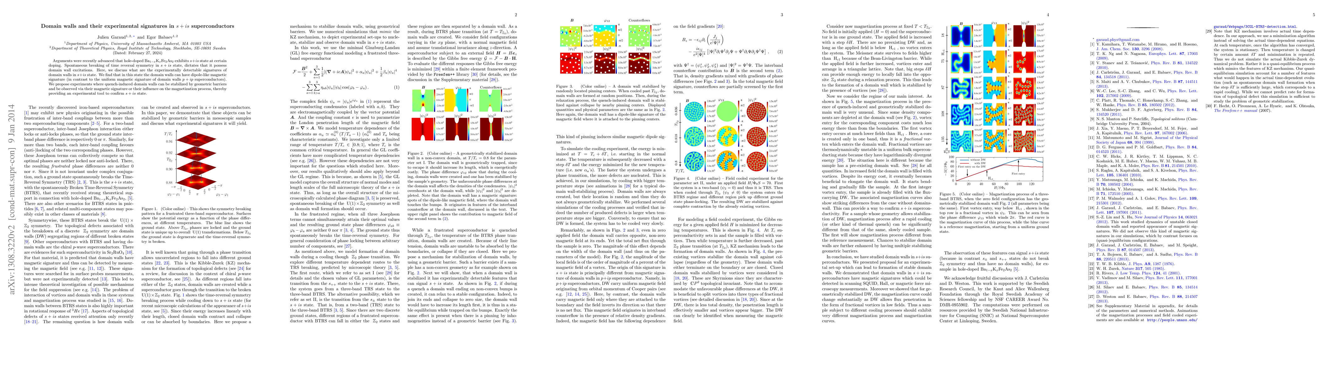 The research employs numerical simulations using a finite element approach with the Freefem++ library to study domain walls in s+is superconductors. It investigates the formation, stabilization, and magnetic signatures of domain walls through quench-induced processes and geometric barriers.