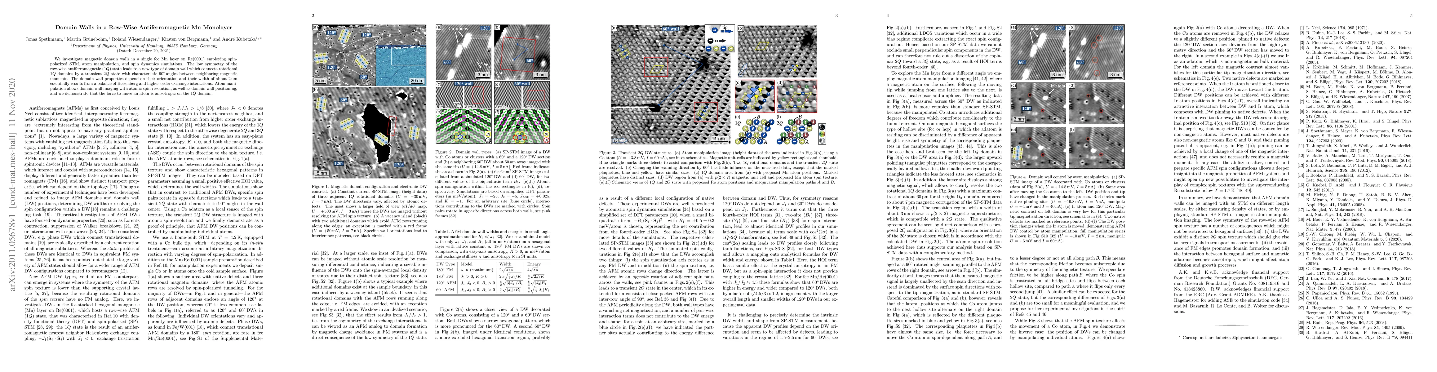 We investigate magnetic domain walls in a single fcc Mn layer on Re(0001) employing spin-polarized STM, atom manipulation, and spin dynamics simulations. The low symmetry of the row-wise antiferromagnetic (1Q) state leads to a new type of domain wall which connects rotational 1Q domains by a transient 2Q state with characteristic 90$^\circ$ angles between neighboring magnetic moments. The domain wall properties depend on their orientation and their width of about 2 nm essentially results from a balance of Heisenberg and higher-order exchange interactions. Atom manipulation allows domain wall imaging with atomic spin-resolution, as well as domain wall positioning, and we demonstrate that the force to move an atom is anisotropic on the 1Q domain.