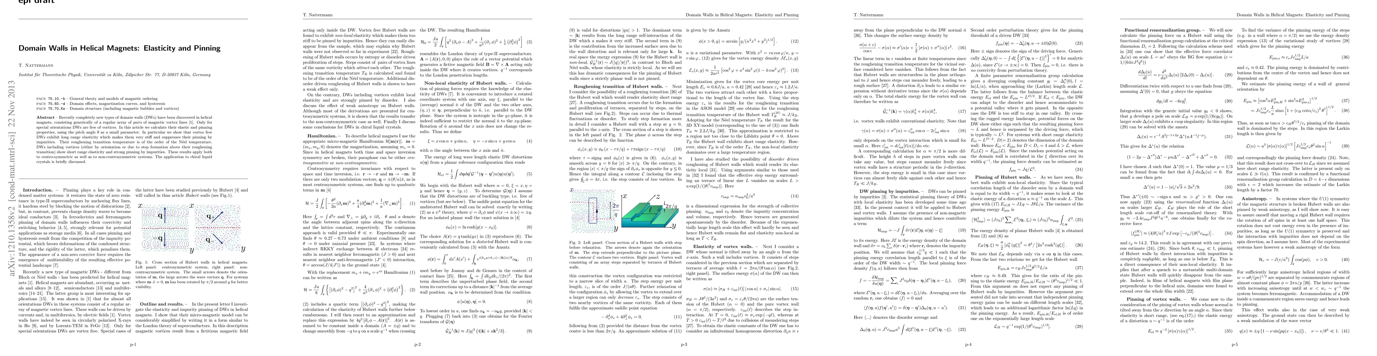 This paper investigates the elasticity and pinning properties of novel domain walls in helical magnets, characterized by pairs of magnetic vortex lines. Vortex-free domain walls exhibit long-range elasticity and low pinning, while those with vortices show short-range elasticity and strong impurity pinning.