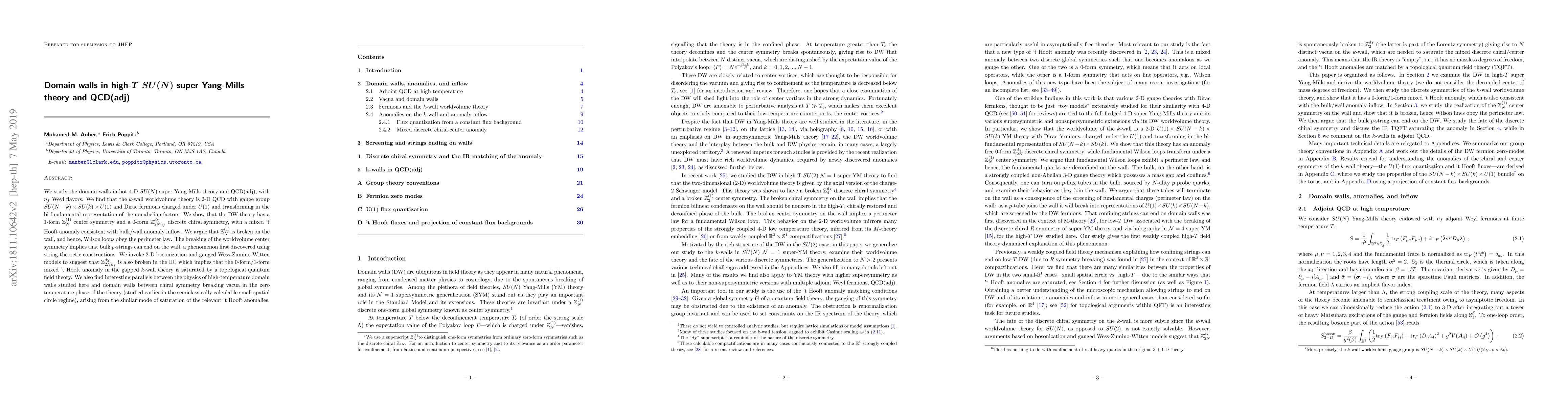 We study the domain walls in hot $4$-D $SU(N)$ super Yang-Mills theory and QCD(adj), with $n_f$ Weyl flavors. We find that the $k$-wall worldvolume theory is $2$-D QCD with gauge group $SU(N-k)\times SU(k) \times U(1)$ and Dirac fermions charged under $U(1)$ and transforming in the bi-fundamental representation of the nonabelian factors. We show that the DW theory has a $1$-form $\mathbb Z_{N}^{(1)}$ center symmetry and a $0$-form $\mathbb Z_{2Nn_f}^{d\chi}$ discrete chiral symmetry, with a mixed 't Hooft anomaly consistent with bulk/wall anomaly inflow. We argue that $\mathbb Z_{N}^{(1)}$ is broken on the wall, and hence, Wilson loops obey the perimeter law. The breaking of the worldvolume center symmetry implies that bulk $p$-strings can end on the wall, a phenomenon first discovered using string-theoretic constructions. We invoke $2$-D bosonization and gauged Wess-Zumino-Witten models to suggest that $\mathbb Z_{2Nn_f}^{d\chi}$ is also broken in the IR, which implies that the $0$-form/$1$-form mixed 't Hooft anomaly in the gapped $k$-wall theory is saturated by a topological quantum field theory. We also find interesting parallels between the physics of high-temperature domain walls studied here and domain walls between chiral symmetry breaking vacua in the zero temperature phase of the theory (studied earlier in the semiclassically calculable small spatial circle regime), arising from the similar mode of saturation of the relevant 't Hooft anomalies.