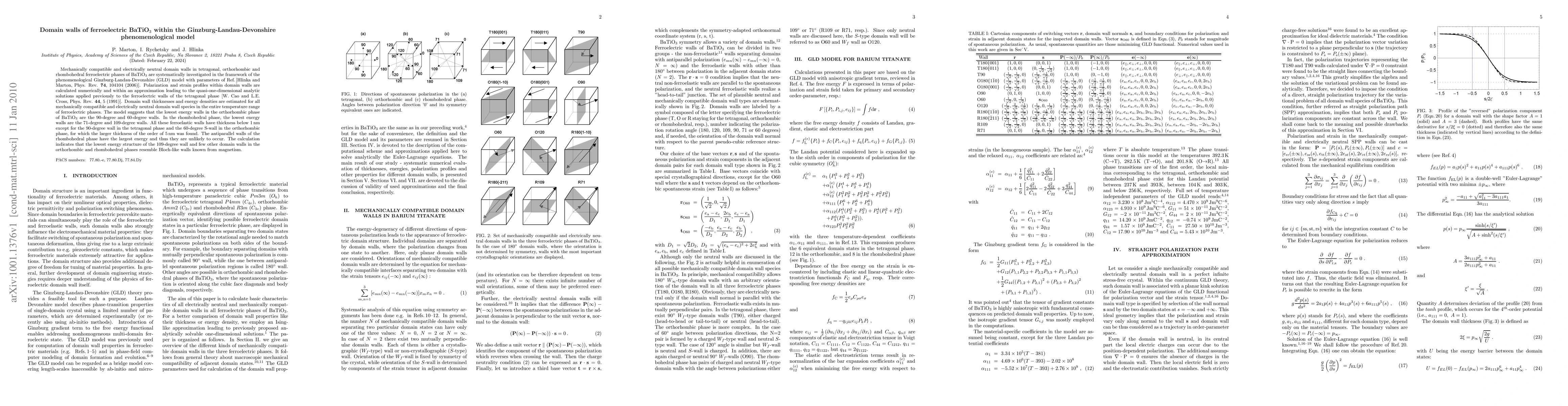 This paper investigates mechanically compatible and electrically neutral domain walls in ferroelectric BaTiO3 phases using the Ginzburg-Landau-Devonshire model. It calculates polarization and strain profiles, finding the lowest energy walls in the orthorhombic phase are 90-degree and 60-degree walls, while rhombohedral phase has 71-degree and 109-degree walls, with most walls having sub-nanometer thicknesses.