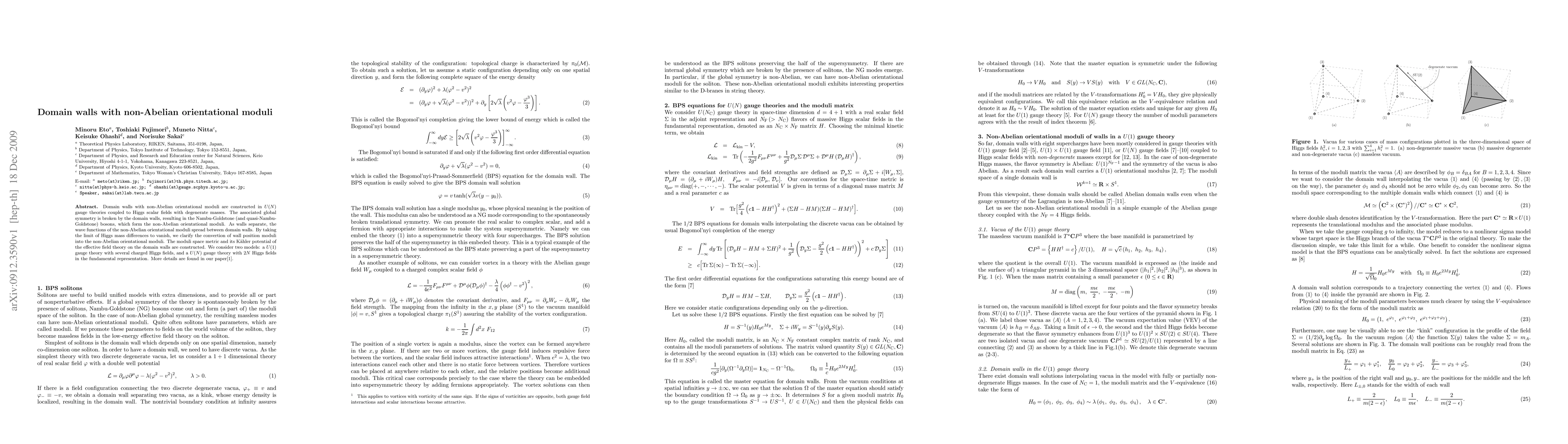 Domain walls with non-Abelian orientational moduli are constructed in U(N) gauge theories coupled to Higgs scalar fields with degenerate masses. The associated global symmetry is broken by the domain walls, resulting in the Nambu-Goldstone (and quasi-Nambu-Goldstone) bosons, which form the non-Abelian orientational moduli. As walls separate, the wave functions of the non-Abelian orientational moduli spread between domain walls. By taking the limit of Higgs mass differences to vanish, we clarify the convertion of wall position moduli into the non-Abelian orientational moduli. The moduli space metric and its Kahler potential of the effective field theory on the domain walls are constructed. We consider two models: a U(1) gauge theory with several charged Higgs fields, and a U(N) gauge theory with 2N Higgs fields in the fundamental representation. More details are found in our paper published in Phys. Rev. D77 (2008) 125008 [arXiv:0802.3135 [hep-th]].