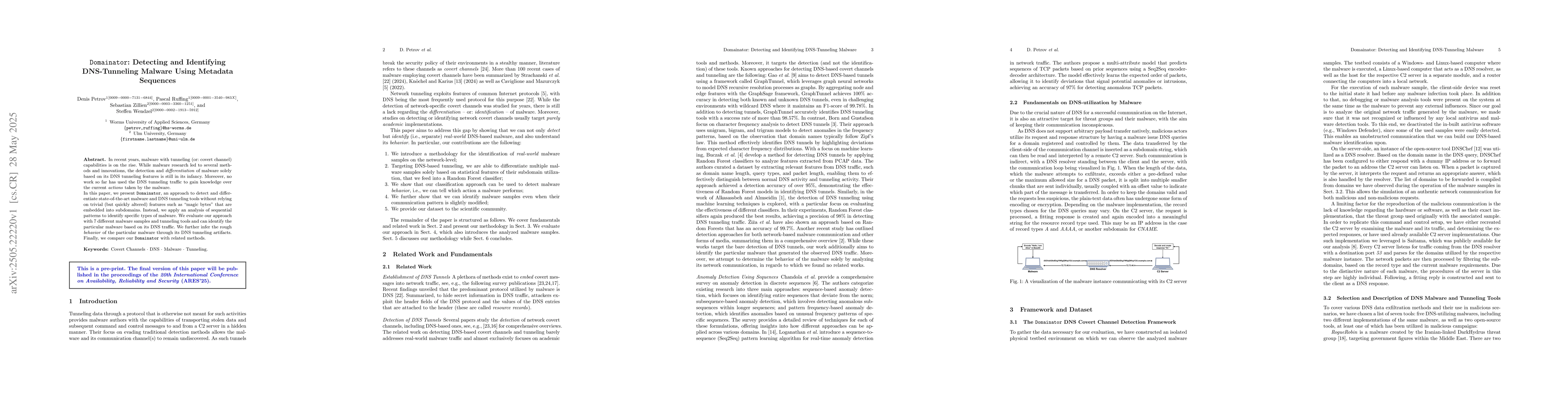 The paper presents Domainator, an approach that detects and differentiates malware and DNS tunneling tools by analyzing sequential patterns in DNS metadata, rather than relying on trivial features like 'magic bytes'.