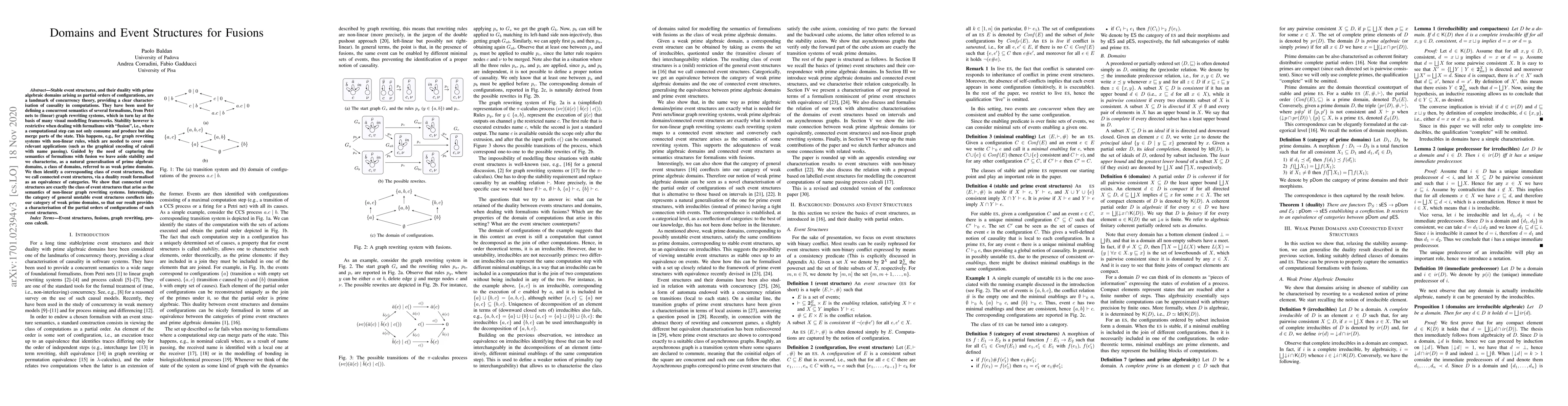 Stable event structures, and their duality with prime algebraic domains arising as partial orders of configurations, are a landmark of concurrency theory, providing a clear characterisation of causality in computations. They have been used for defining a concurrent semantics of several formalisms, from Petri nets to (linear) graph rewriting systems, which in turn lay at the basis of many visual modelling frameworks. Stability however is restrictive when dealing with formalisms with "fusion", i.e., where a computational step can not only consume and produce but also merge parts of the state. This happens, e.g., for graph rewriting systems with non-linear rules, which are needed to cover some relevant applications (such as the graphical encoding of calculi with name passing). Guided by the need of capturing the semantics of formalisms with fusion we leave aside stability and we characterise, as a natural generalisation of prime algebraic domains, a class of domains, referred to as weak prime domains. We then identify a corresponding class of event structures, that we call connected event structures, via a duality result formalised as an equivalence of categories. We show that connected event structures are exactly the class of event structures that arise as the semantics of non-linear graph rewriting systems. Interestingly, the category of general unstable event structures coreflects into our category of weak prime domains, so that our result provides a characterisation of the partial orders of configurations of such event structures.
