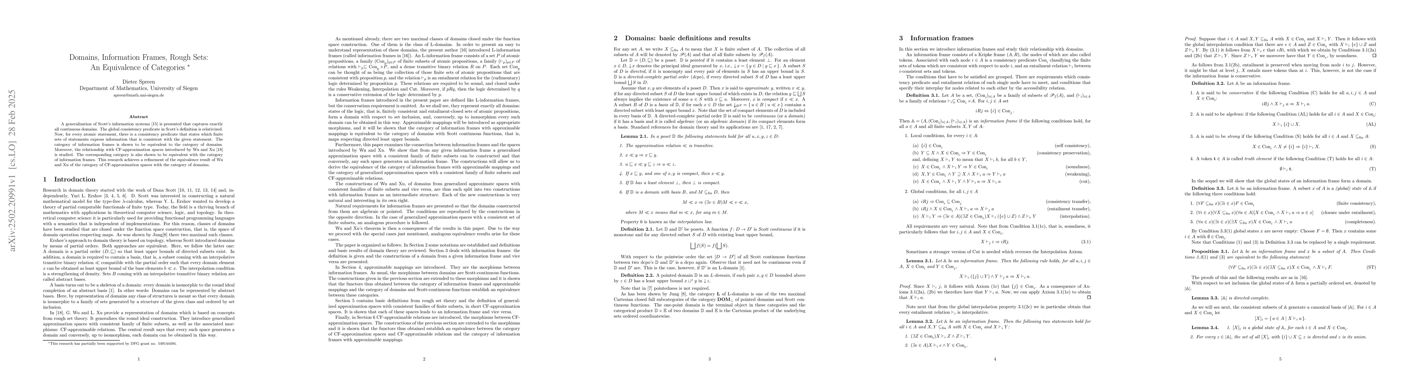 The paper introduces a functorial approach to relate information frames and domains, demonstrating an equivalence between their categories and extending this to CF-approximation spaces.