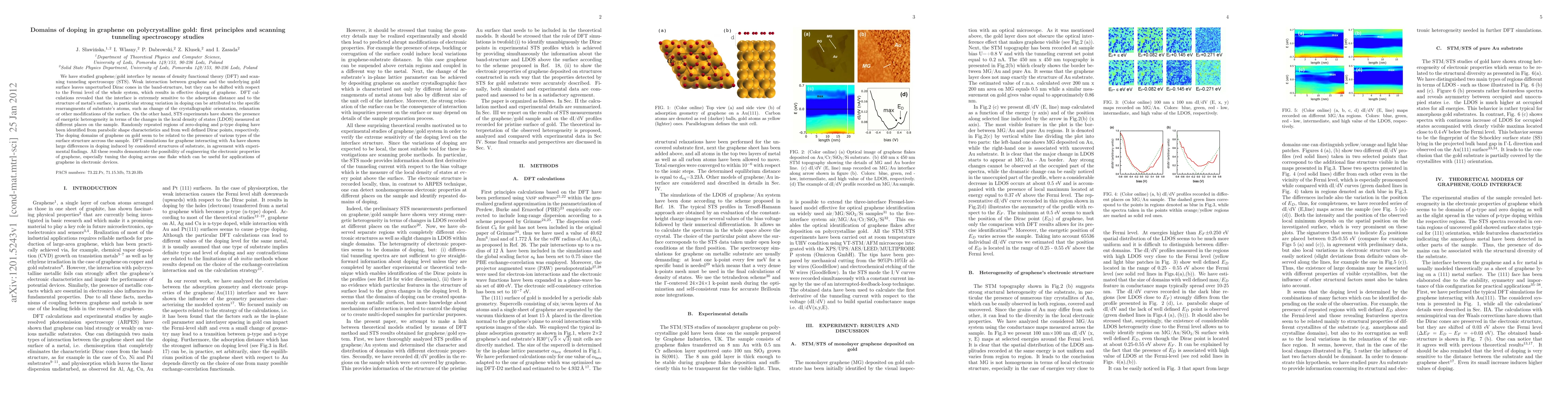 This paper explores the doping domains in graphene on polycrystalline gold using density functional theory and scanning tunneling spectroscopy. The study reveals that weak graphene-gold interaction allows for effective doping through shifts in Dirac cones relative to the Fermi level, with significant variations in doping linked to substrate surface structure modifications.