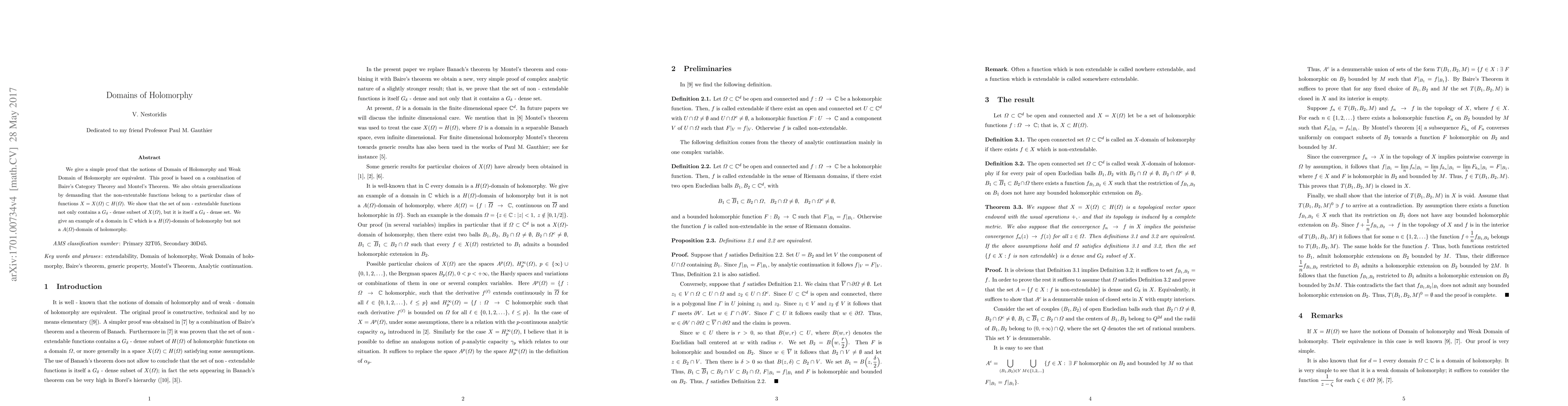 Summary: This paper presents a simpler proof for the equivalence of Domains of Holomorphy and Weak Domains of Holomorphy using Baire's Category Theorem and Montel's Theorem, and explores generalizations based on specific classes of holomorphic functions. It provides an example illustrating the distinction between domains that allow holomorphic extension versus those that do not.