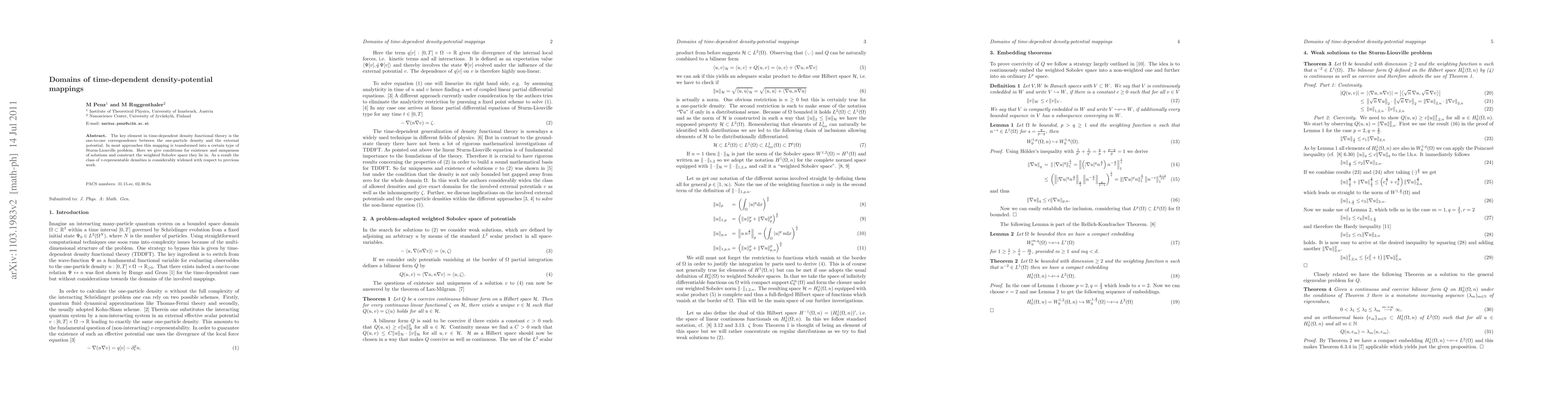 The key element in time-dependent density functional theory is the one-to-one correspondence between the one-particle density and the external potential. In most approaches this mapping is transformed into a certain type of Sturm-Liouville problem. Here we give conditions for existence and uniqueness of solutions and construct the weighted Sobolev space they lie in. As a result the class of v-representable densities is considerably widened with respect to previous work.
