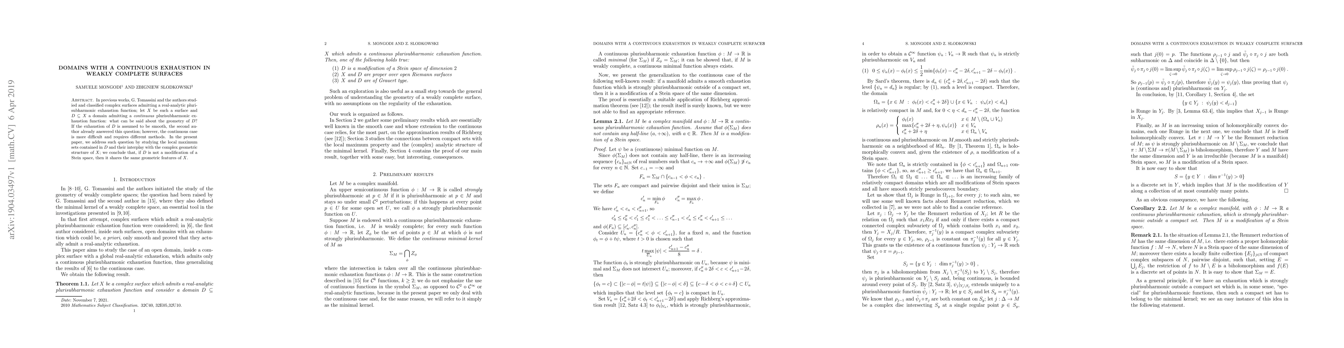 Researchers investigate domains on complex surfaces that admit continuous exhaustion functions, finding they share similar geometric features if not modified from Stein spaces.