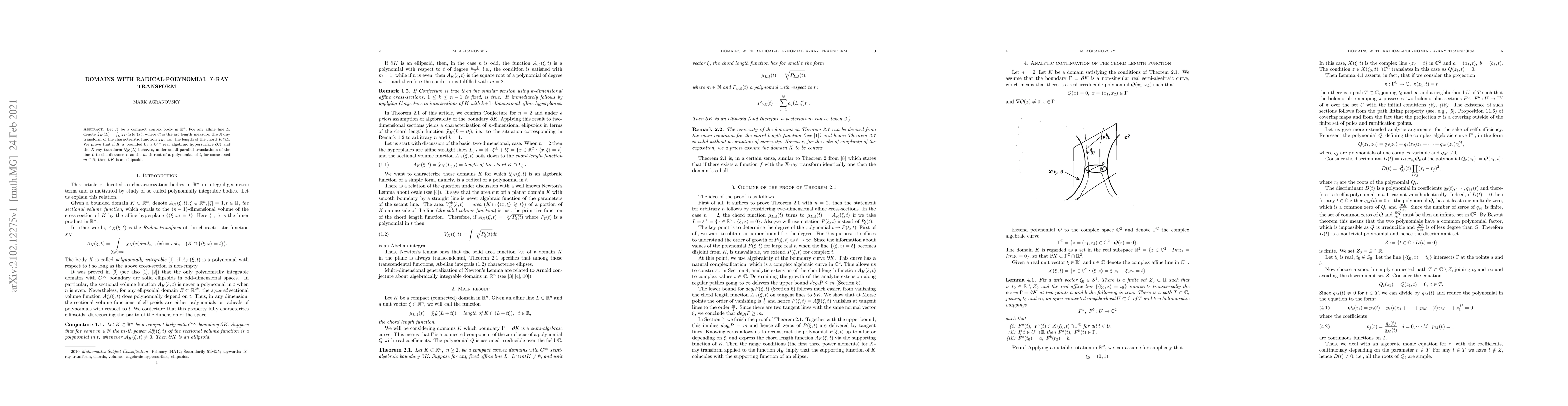 Let $K$ be a compact convex body in $\mathbb R^n.$ For any affine line $L,$ denote $\widehat{\chi}_K(L)=\int_{L}\chi_K(x)dl(x),$ where $dl$ is the arc length measure, the $X$-ray transform of the characteristic function $\chi_K,$ i.e., the length of the chord $K \cap L.$ We prove that if $K$ is bounded by a $C^{\infty}$ real algebraic hypersurface $\partial K$ and the $X$-ray transform $\widehat{\chi}_K(L)$ behaves, under small parallel translations of the line $L$ to the distance $t,$ as the $m$-th root of a polynomial of $t$, for some fixed $m \in \mathbb N,$ then $\partial K$ is an ellipsoid.