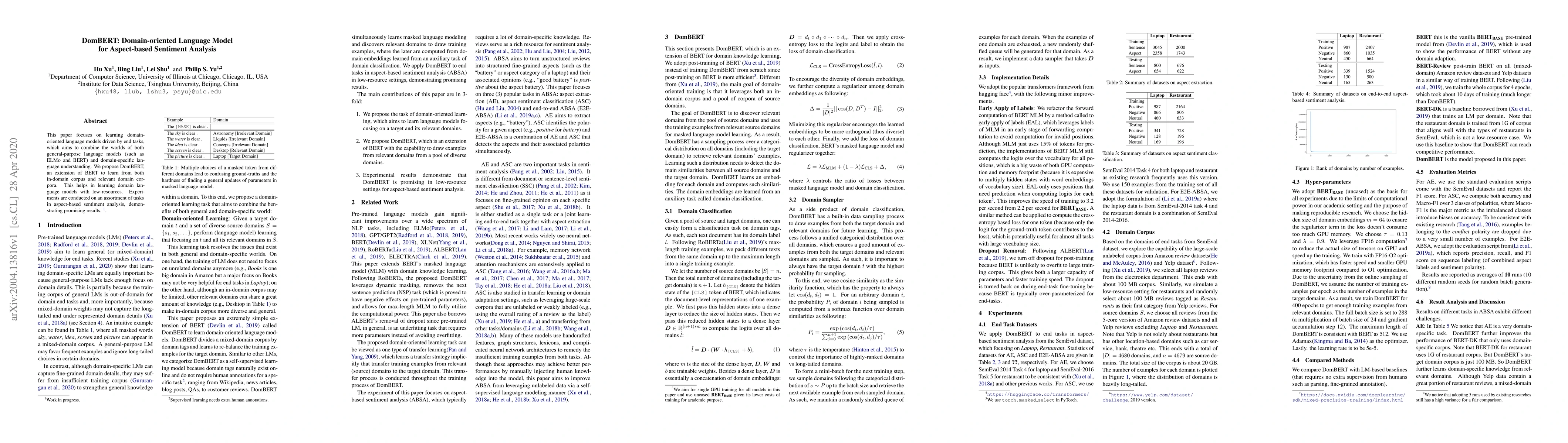 DomBERT extends BERT to learn from both in-domain and relevant domain corpora, achieving domain-specific language understanding with limited resources. Experiments show promising results in aspect-based sentiment analysis tasks.