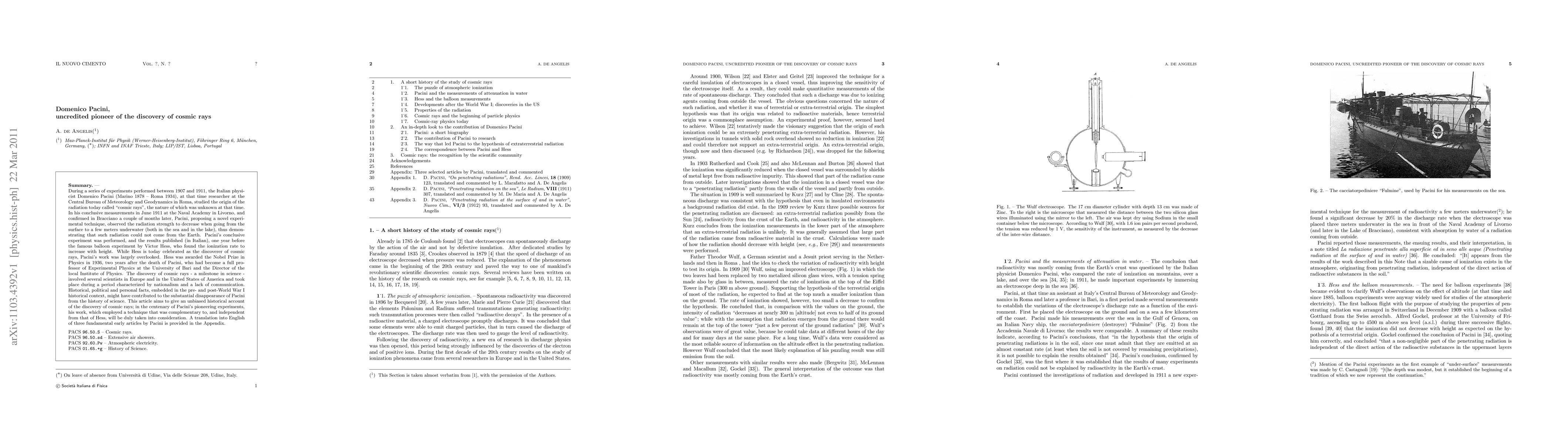 Domenico Pacini discovered cosmic rays in 1911, showing they couldn't come from Earth's crust, but his work was largely overlooked until the centenary of his experiments.