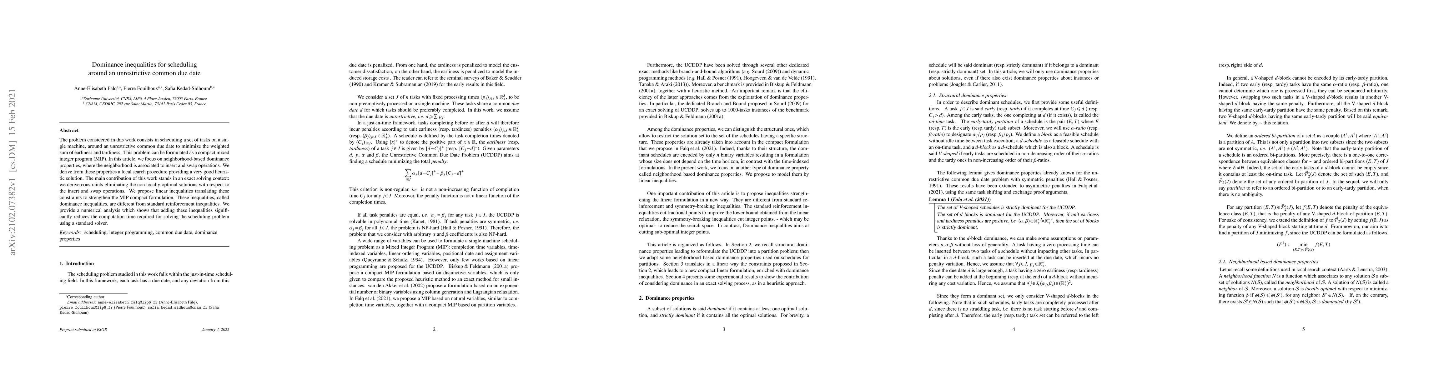 The problem considered in this work consists in scheduling a set of tasks on a single machine, around an unrestrictive common due date to minimize the weighted sum of earliness and tardiness. This problem can be formulated as a compact mixed integer program (MIP). In this article, we focus on neighborhood-based dominance properties, where the neighborhood is associated to insert and swap operations. We derive from these properties a local search procedure providing a very good heuristic solution. The main contribution of this work stands in an exact solving context: we derive constraints eliminating the non locally optimal solutions with respect to the insert and swap operations. We propose linear inequalities translating these constraints to strengthen the MIP compact formulation. These inequalities, called dominance inequalities, are different from standard reinforcement inequalities. We provide a numerical analysis which shows that adding these inequalities significantly reduces the computation time required for solving the scheduling problem using a standard solver.
