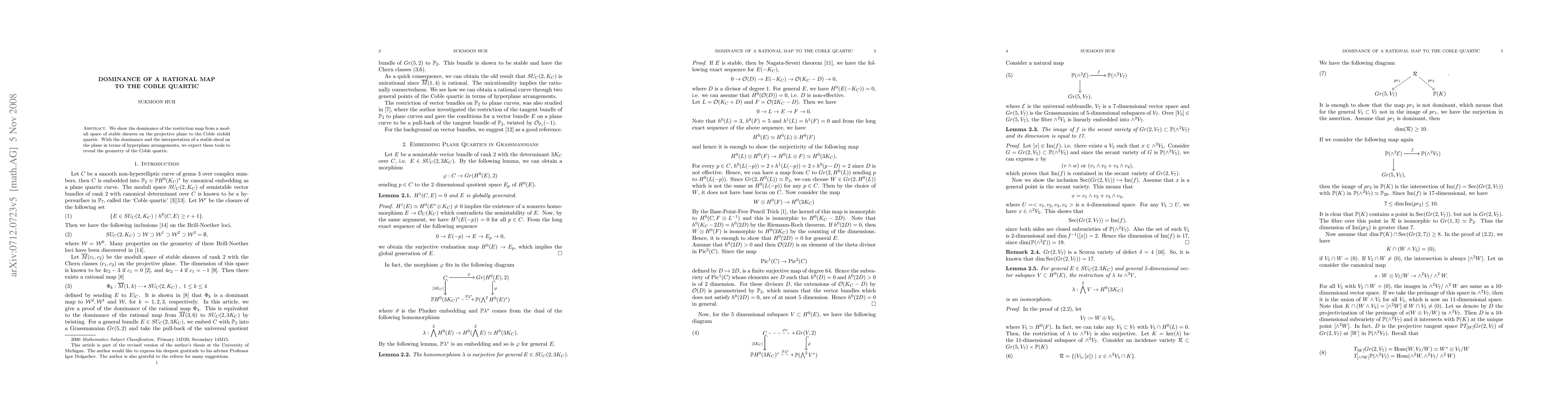 We show the dominance of the restriction map from a moduli space of stable sheaves on the projective plane to the Coble quartic. With the dominance and the interpretation of a stable sheaf on the plane in terms of the hyperplane arrangements, we expect to investigate the geometry of the Coble quartic.