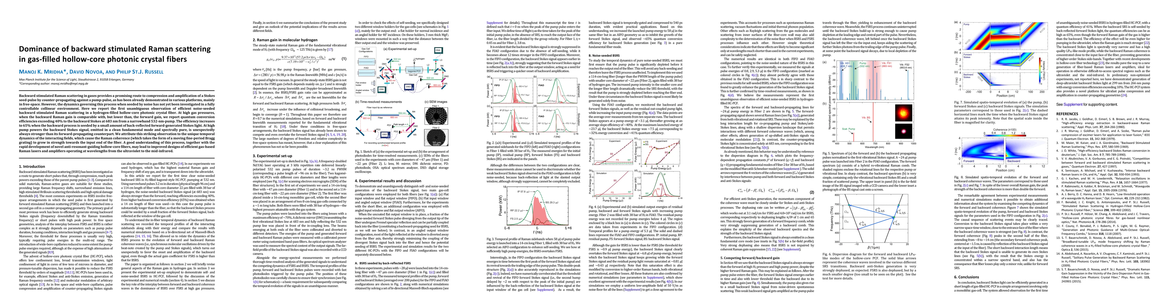 Backward stimulated Raman scattering in gases provides a promising route to compression and amplification of a Stokes seed-pulse by counter-propagating against a pump-pulse, as has been already demonstrated in various platforms, mainly in free-space. However, the dynamics governing this process when seeded by noise has not yet been investigated in a fully controllable collinear environment. Here we report the first unambiguous observation of efficient noise-seeded backward stimulated Raman scattering in a hydrogen-filled hollow-core photonic crystal fiber. At high gas pressures, when the backward Raman gain is comparable with, but lower than, the forward gain, we report quantum conversion efficiencies exceeding 40% to the backward Stokes at 683 nm from a narrowband 532-nm-pump. The efficiency increases to 65% when the backward process is seeded by a small amount of back-reflected forward-generated Stokes light. At high pump powers the backward Stokes signal, emitted in a clean fundamental mode and spectrally pure, is unexpectedly always stronger than its forward-propagating counterpart. We attribute this striking observation to the unique temporal dynamics of the interacting fields, which cause the Raman coherence (which takes the form of a moving fine-period Bragg grating) to grow in strength towards the input end of the fiber. A good understanding of this process, together with the rapid development of novel anti-resonant-guiding hollow-core fibers, may lead to improved designs of efficient gas-based Raman lasers and amplifiers operating at wavelengths from the ultraviolet to the mid-infrared.