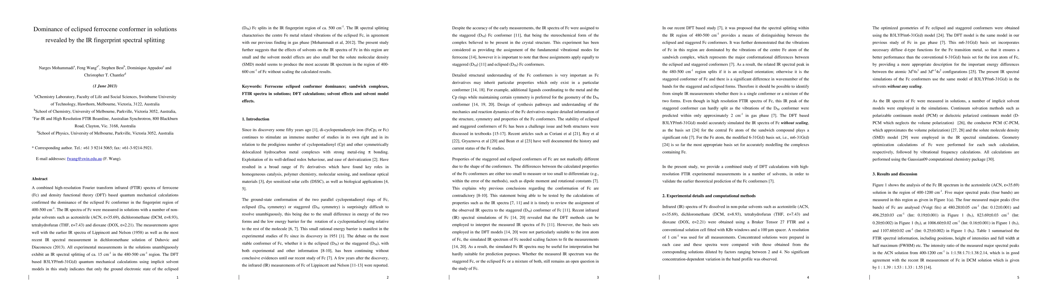 A combined high-resolution Fourier transform infrared (FTIR) spectra of ferrocene (Fc) and density functional theory (DFT) based quantum mechanical calculations confirmed the dominance of the eclipsed Fc conformer in the fingerprint region of 400-500 cm-1. The IR spectra of Fc were measured in solutions with a number of non-polar solvents such as acetonitrile, dichloromethane, tetrahydrofuran and dioxane. The measurements agree well with the earlier IR spectra of Lippincott and Nelson (1958) as well as the most recent IR spectral measurement in dichloromethane solution of Duhovic and Diaconescu (2013). All experimental measurements in the solutions unambiguously exhibit an IR spectral splitting of ca. 15 cm-1 in the 480-500 cm-1 region. The DFT based B3LYP/m6-31G(d) quantum mechanical calculations using implicit solvent models in this study indicates that only the ground electronic state of the eclipsed (D5h) Fc splits in the IR fingerprint region of ca. 500 cm-1. The IR spectral splitting characterises the centre Fe metal related vibrations of the eclipsed Fc, in agreement with our previous finding in gas phase [Mohammadi et al, 2012]. The present study further suggests that the effects of solvents on the IR spectra of Fc in this region are small and the solvent model effects are also small but the solute molecular density (SMD) model seems to produce the most accurate IR spectrum in the region of 400-600 cm-1 of Fc without scaling the calculated results.