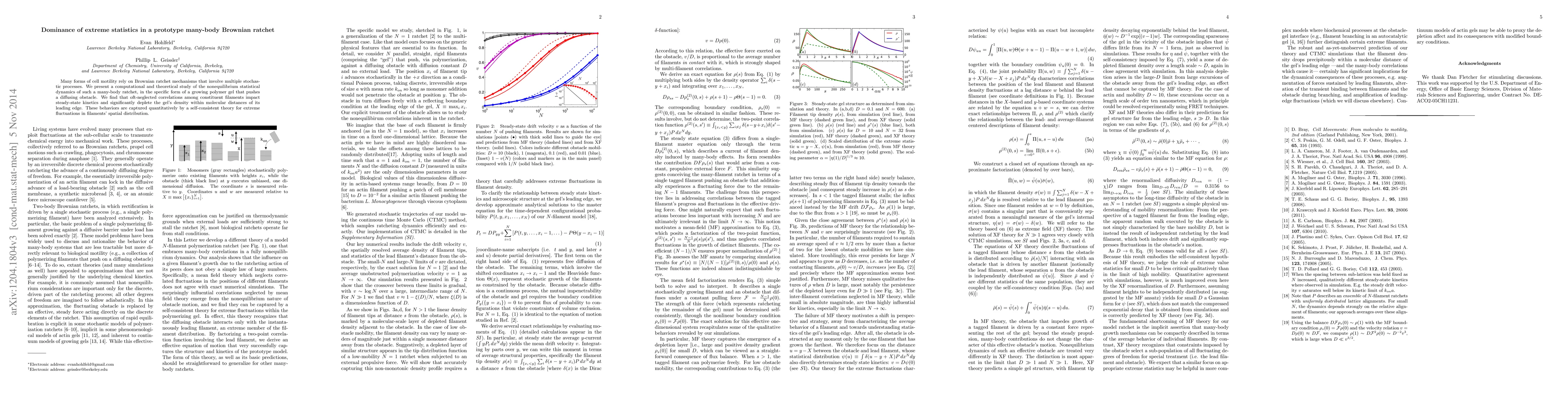 Many forms of cell motility rely on Brownian ratchet mechanisms that involve multiple stochastic processes. We present a computational and theoretical study of the nonequilibrium statistical dynamics of such a many-body ratchet, in the specific form of a growing polymer gel that pushes a diffusing obstacle. We find that oft-neglected correlations among constituent filaments impact steady-state kinetics and significantly deplete the gel's density within molecular distances of its leading edge. These behaviors are captured quantitatively by a self-consistent theory for extreme fluctuations in filaments' spatial distribution.