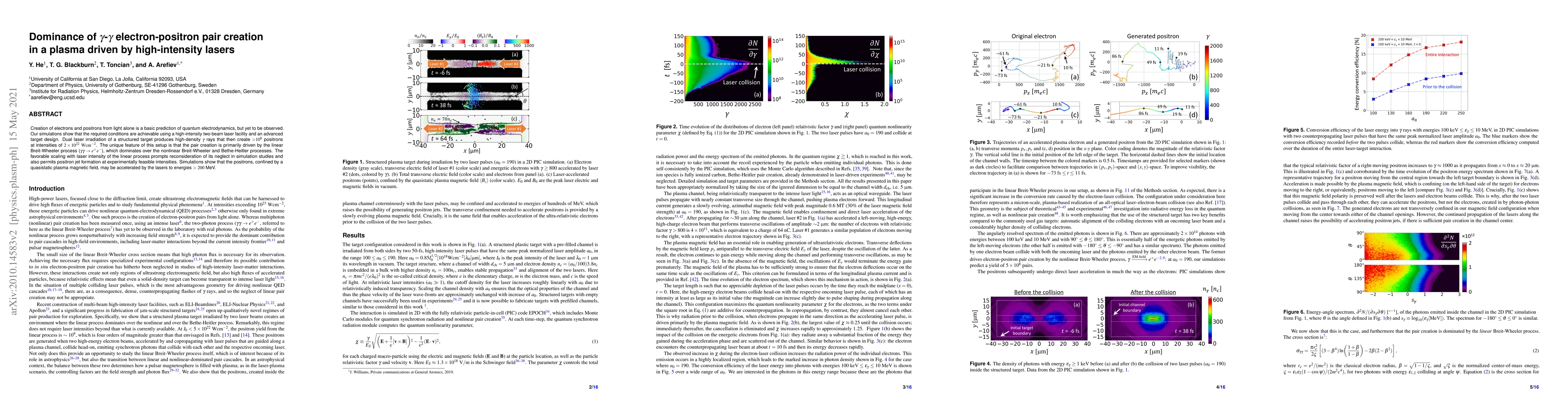 Creation of electrons and positrons from light alone is a basic prediction of quantum electrodynamics, but yet to be observed. Here we show that it is possible to create ${>}10^8$ positrons by dual laser irradiation of a structured plasma target, at intensities of $2 \times 10^{22} \mathrm{W}\mathrm{cm}^{-2}$. In contrast to previous work, the pair creation is primarily driven by the linear Breit-Wheeler process ($\gamma\gamma \to e^+ e^-$), not the nonlinear process assumed to be dominant at high intensity, because of the high density of $\gamma$ rays emitted inside the target. The favorable scaling with laser intensity of the linear process prompts reconsideration of its neglect in simulation studies, but also permits positron jet formation at intensities that are already experimentally feasible. Simulations show that the positrons, confined by a quasistatic plasma magnetic field, may be accelerated by the lasers to energies $> 200$ MeV.