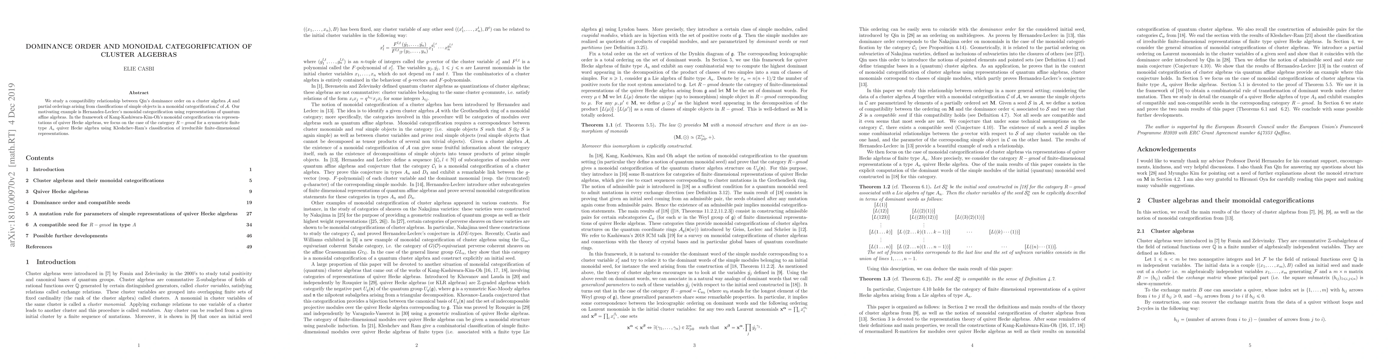 This paper explores the compatibility between Qin's dominance order on cluster algebras and orderings from monoidal categorifications, specifically focusing on Hernandez-Leclerc's and Kang-Kashiwara-Kim-Oh's frameworks using representations of quantum affine and quiver Hecke algebras, respectively. The study highlights the case of the category $R-gmod$ for symmetric finite type $A$ quiver Hecke algebras.