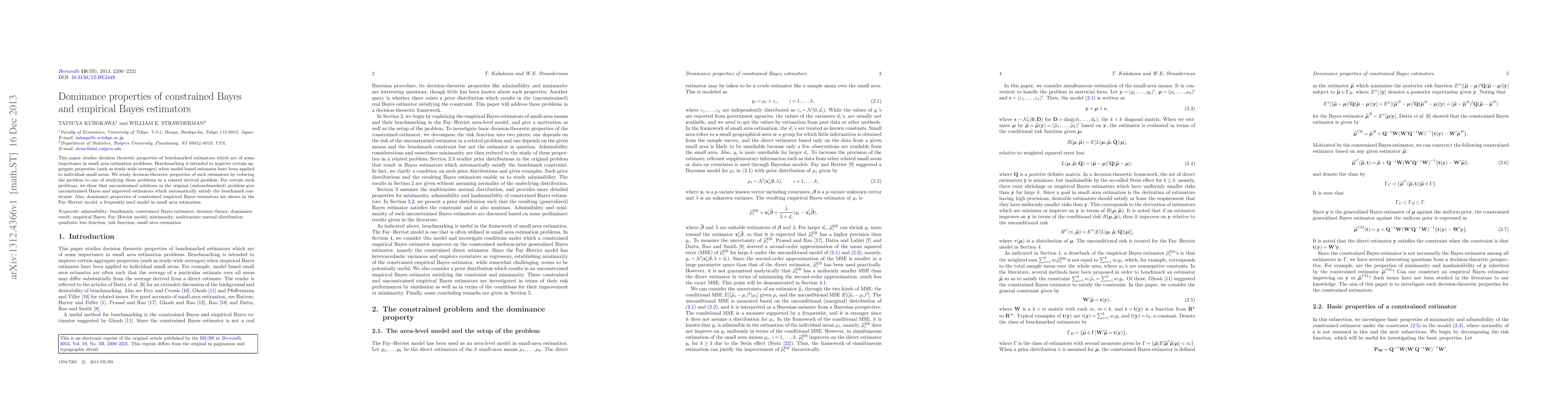 This paper investigates the decision-theoretic properties of benchmarked estimators used in small area estimation, demonstrating that unconstrained Bayes estimators can satisfy benchmark constraints. It also shows dominance properties of constrained empirical Bayes estimators within the Fay-Herriot model.