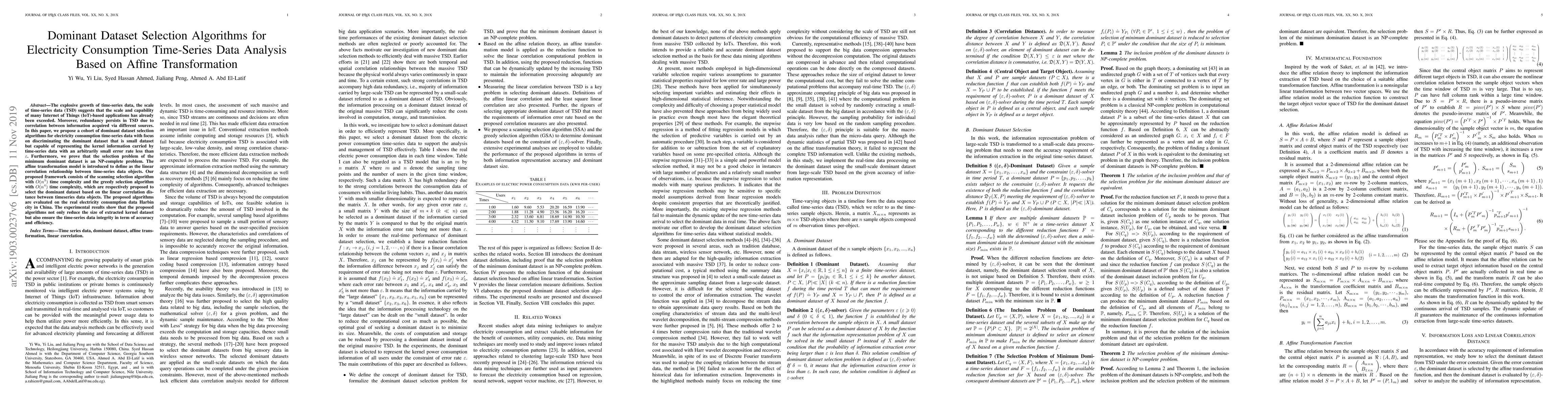 The explosive growth of time-series data, the scale of time-series data (TSD) suggests that the scale and capability of many Internet of Things (IoT)-based applications has already been exceeded. Moreover, redundancy persists in TSD due to the correlation between information acquired via different sources. In this paper, we propose a cohort of dominant dataset selection algorithms for electricity consumption time-series data with a focus on discriminating the dominant dataset that is small dataset but capable of representing the kernel information carried by time-series data with an arbitrarily small error rate less than ". Furthermore, we prove that the selection problem of the minimum dominant dataset is an NP-complete problem. The affine transformation model is introduced to define the linear correlation relationship between time-series data objects. Our proposed framework consists of the scanning selection algorithm with O(n3) time complexity and the greedy selection algorithm with O(n4) time complexity, which are respectively proposed to select the dominant dataset based on the linear correlation distance between time-series data objects. The proposed algorithms are evaluated on the real electricity consumption data Harbin city in China. The experimental results show that the proposed algorithms not only reduce the size of the extracted kernel dataset but also ensure the time-series data integrity in terms of accuracy and efficiency.