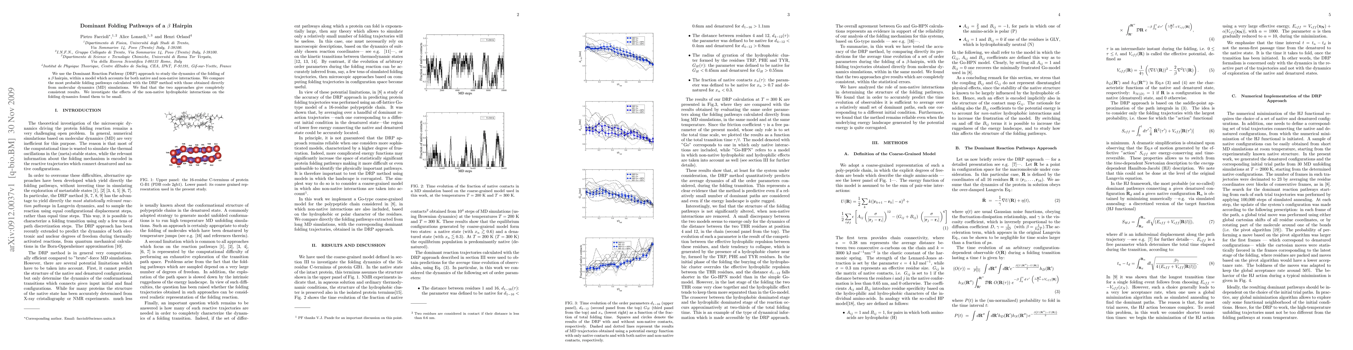 We use the Dominant Reaction Pathway (DRP) approach to study the dynamics of the folding of a beta-hairpin, within a model which accounts for both native and non-native interactions. We compare the most probable folding pathways calculated with the DRP method with those obtained directly from molecular dynamics (MD) simulations. We find that the two approaches give completely consistent results. We investigate the effects of the non-native hydrophobic interactions on the folding dynamics found them to be small.