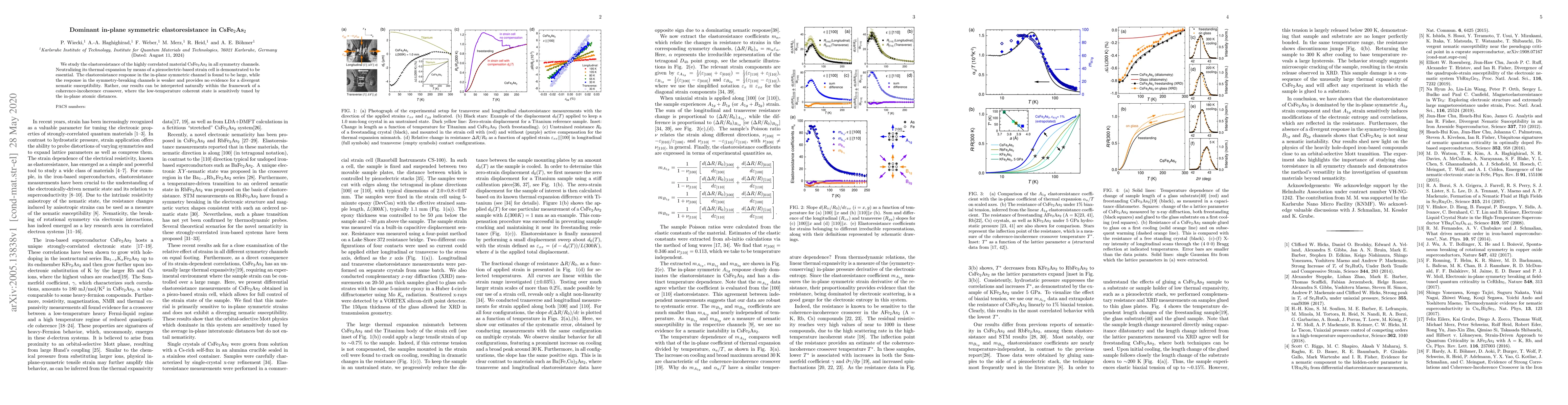 We study the elastoresistance of the highly correlated material CsFe2As2 in all symmetry channels. Neutralizing its thermal expansion by means of a piezoelectric-based strain cell is demonstrated to be essential. The elastoresistance response in the in-plane symmetric channel is found to be large, while the response in the symmetry-breaking channels is weaker and provides no evidence for a divergent nematic susceptibility. Rather, our results can be interpreted naturally within the framework of a coherence-incoherence crossover, where the low-temperature coherent state is sensitively tuned by the in-plane atomic distances.