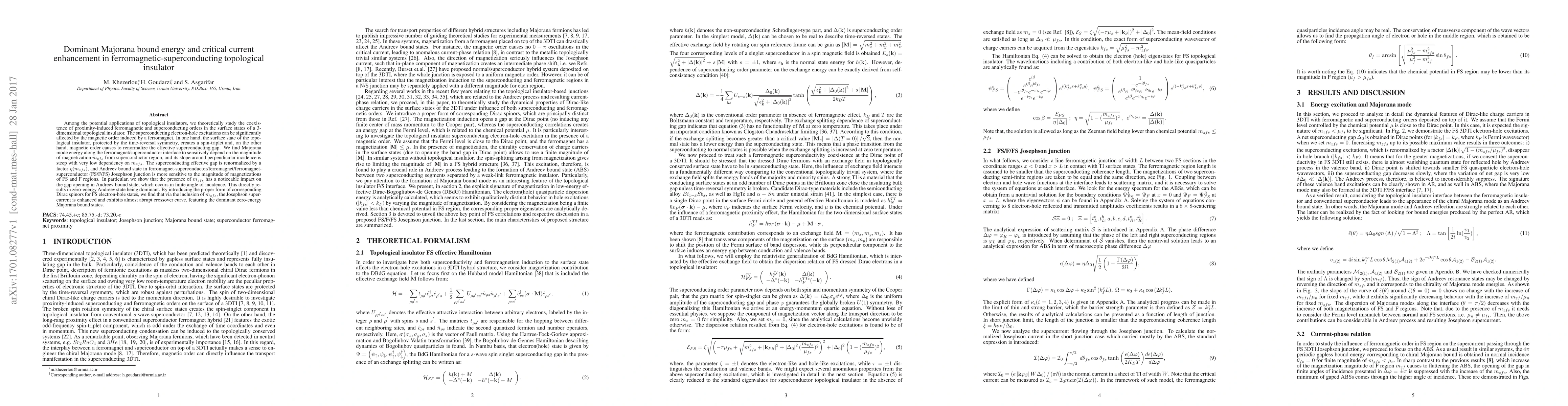 Among the potential applications of topological insulators, we theoretically study the coexistence of proximity-induced ferromagnetic and superconducting orders in the surface states of a 3-dimensional topological insulator. The superconducting electron-hole excitations can be significantly affected by the magnetic order induced by a ferromagnet. In one hand, the surface state of the topological insulator, protected by the time-reversal symmetry, creates a spin-triplet and, on the other hand, magnetic order causes to renormalize the effective superconducting gap. We find Majorana mode energy along the ferromagnet/superconductor interface to sensitively depend on the magnitude of magnetization $m_{zfs}$ from superconductor region, and its slope around perpendicular incidence is steep with very low dependency on $m_{zfs}$. The superconducting effective gap is renormalized by a factor $\eta(m_{zfs})$, and Andreev bound state in ferromagnet-superconductor/ferromagnet/ferromagnet-superconductor (FS/F/FS) Josephson junction is more sensitive to the magnitude of magnetizations of FS and F regions. In particular, we show that the presence of $m_{zfs}$ has a noticeable impact on the gap opening in Andreev bound state, which occurs in finite angle of incidence. This directly results in zero-energy Andreev state being dominant. By introducing the proper form of corresponding Dirac spinors for FS electron-hole states, we find that via the inclusion of $m_{zfs}$, the Josephson supercurrent is enhanced and exhibits almost abrupt crossover curve, featuring the dominant zero-energy Majorana bound states.