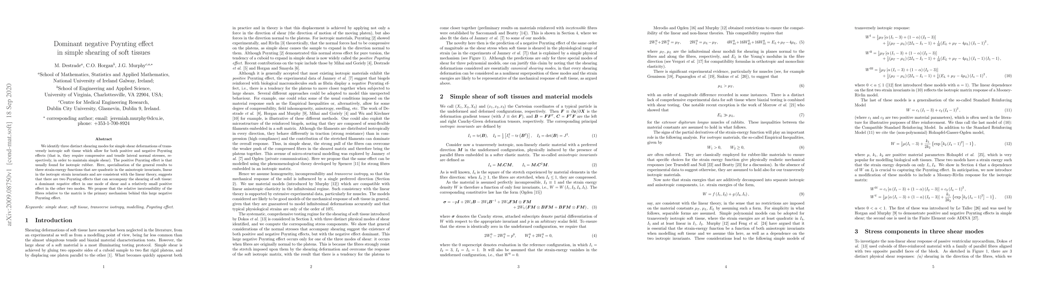 We identify three distinct shearing modes for simple shear deformations of transversely isotropic soft tissue which allow for both positive and negative Poynting effects (that is, they require compressive and tensile lateral normal stresses, respectively, in order to maintain simple shear). The positive Poynting effect is that usually found for isotropic rubber. Here, specialisation of the general results to three strain-energy functions which are quadratic in the anisotropic invariants, linear in the isotropic strain invariants and consistent with the linear theory suggests that there are two Poynting effects which can accompany the shearing of soft tissue: a dominant negative effect in one mode of shear and a relatively small positive effect in the other two modes. We propose that the relative inextensibility of the fibres relative to the matrix is the primary mechanism behind this large negative Poynting effect.