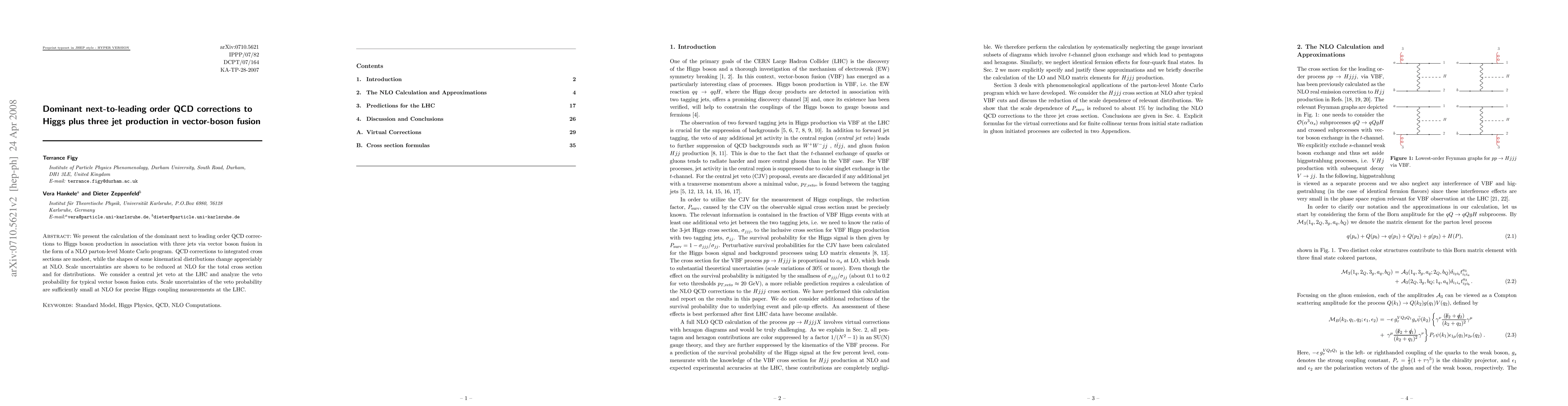 This paper calculates the dominant next-to-leading order QCD corrections for Higgs plus three-jet production in vector-boson fusion, showing modest corrections to cross-sections but significant changes in kinematic distributions. The study also demonstrates reduced scale uncertainties at NLO, crucial for precise Higgs coupling measurements at the LHC.