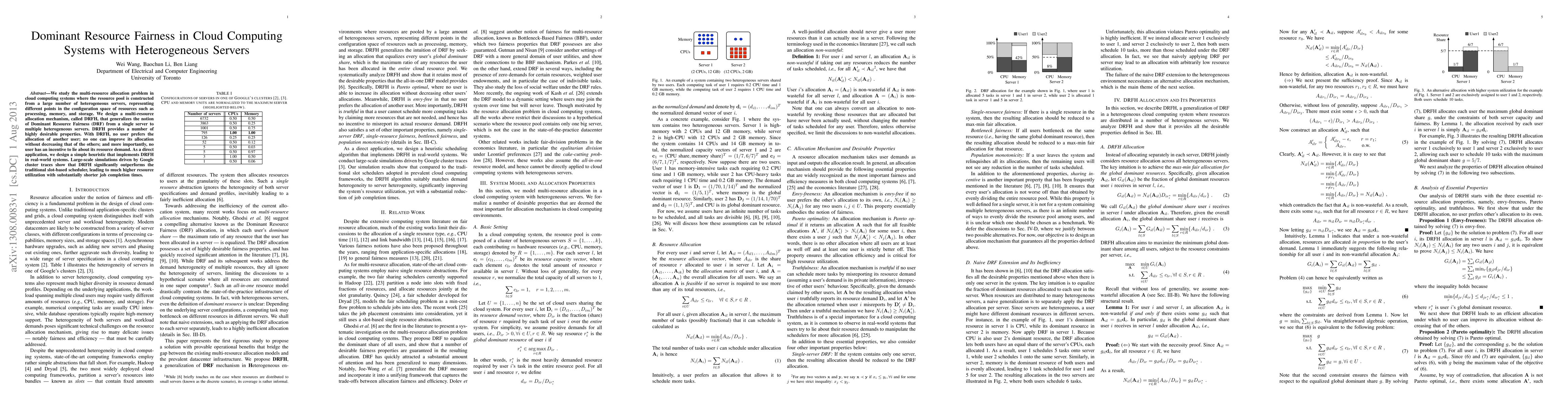 This paper proposes DRFH, a multi-resource allocation mechanism for cloud computing systems with heterogeneous servers, ensuring Dominant Resource Fairness and high resource utilization. Simulations show DRFH significantly outperforms traditional schedulers, achieving better resource utilization and shorter job completion times.