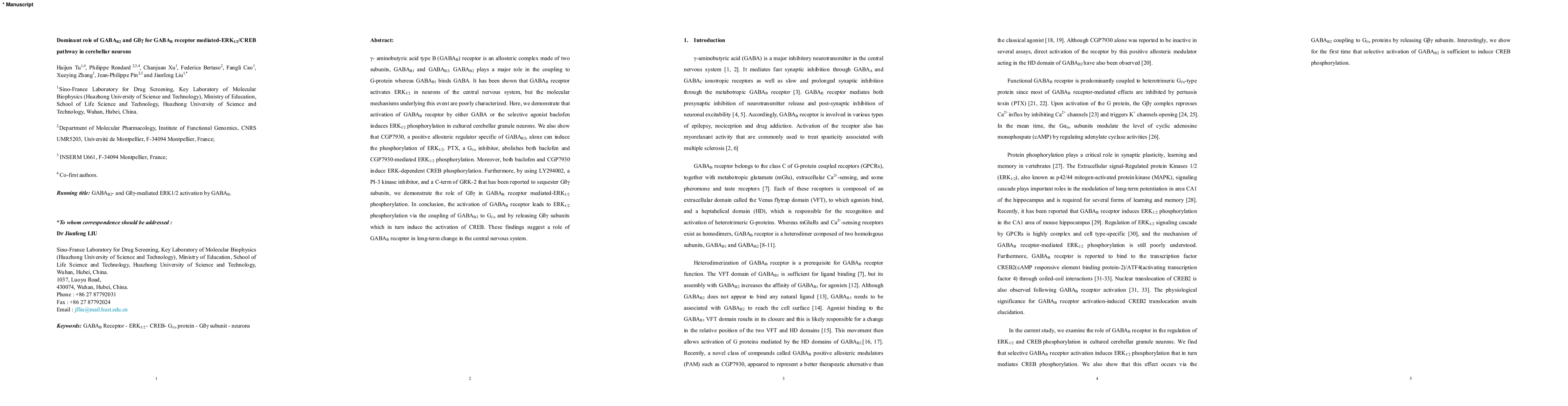 gamma-aminobutyric acid type B (GABA(B)) receptor is an allosteric complex made of two subunits, GABA(B1) and GABA(B2). GABA(B2) plays a major role in the coupling to G protein whereas GABA(B1) binds GABA. It has been shown that GABA(B) receptor activates ERK(1/2) in neurons of the central nervous system, but the molecular mechanisms underlying this event are poorly characterized. Here, we demonstrate that activation of GABA(B) receptor by either GABA or the selective agonist baclofen induces ERK(1/2) phosphorylation in cultured cerebellar granule neurons. We also show that CGP7930, a positive allosteric regulator specific of GABA(B2), alone can induce the phosphorylation of ERK(1/2). PTX, a G(i/o) inhibitor, abolishes both baclofen and CGP7930-mediated-ERK(1/2) phosphorylation. Moreover, both baclofen and CGP7930 induce ERK-dependent CREB phosphorylation. Furthermore, by using LY294002, a PI-3 kinase inhibitor, and a C-term of GRK-2 that has been reported to sequester Gbetagamma subunits, we demonstrate the role of Gbetagamma in GABA(B) receptor-mediated-ERK(1/2) phosphorylation. In conclusion, the activation of GABA(B) receptor leads to ERK(1/2) phosphorylation via the coupling of GABA(B2) to G(i/o) and by releasing Gbetagamma subunits which in turn induce the activation of CREB. These findings suggest a role of GABA(B) receptor in long-term change in the central nervous system.