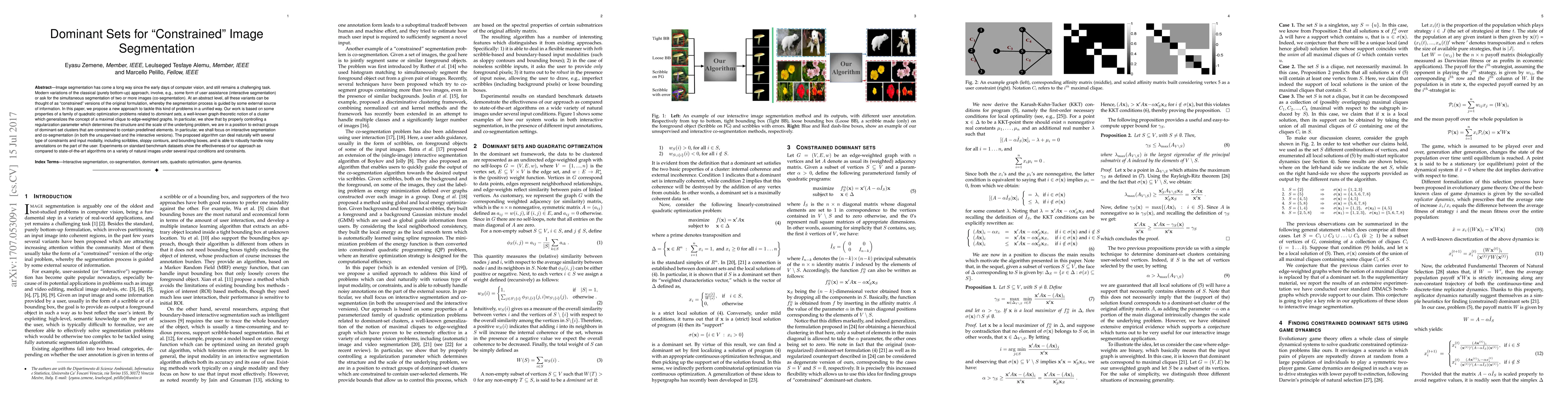 This paper proposes a new method for "constrained" image segmentation, leveraging dominant sets and quadratic optimization to handle interactive and co-segmentation tasks. The approach effectively manages various types of user inputs and constraints, demonstrating superior performance on benchmark datasets compared to existing algorithms.
