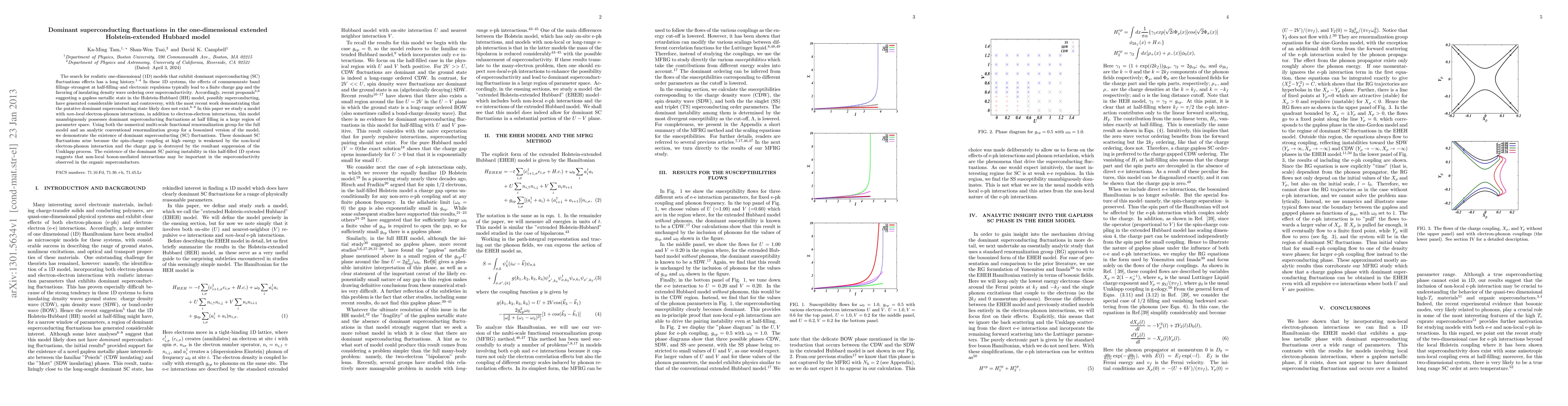 This paper investigates a one-dimensional extended Holstein-Extended Hubbard model with non-local electron-phonon interactions, demonstrating dominant superconducting fluctuations at half-filling. The study uses both numerical and analytic methods to show that these fluctuations arise due to weakened spin-charge coupling and suppression of the Umklapp process, suggesting potential relevance for superconductivity in organic superconductors.
