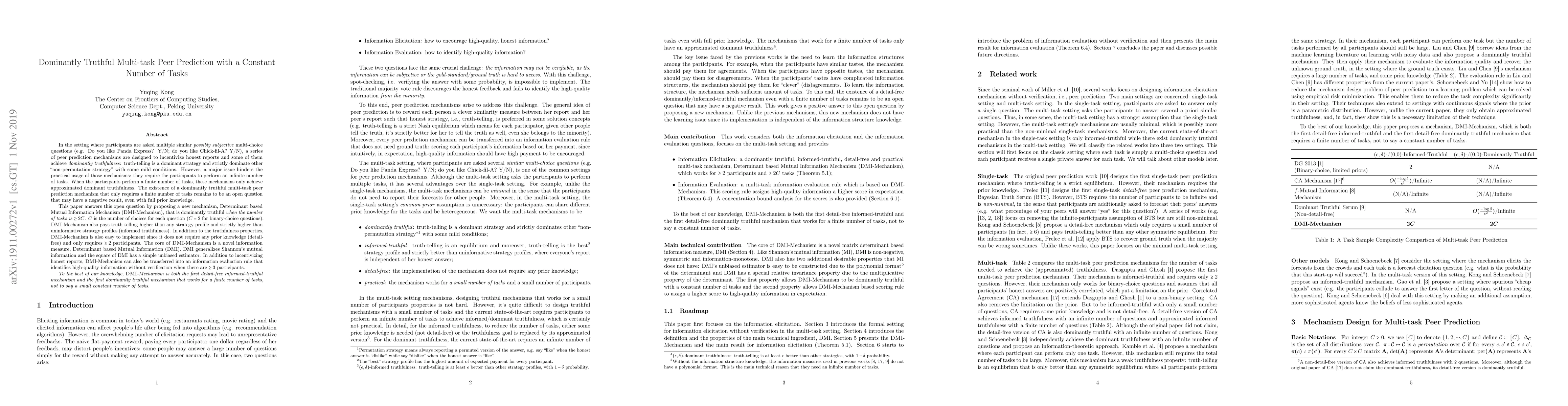 This paper introduces the Determinant based Mutual Information Mechanism (DMI-Mechanism), which is dominantly truthful for a finite number of tasks, specifically when there are at least 2 tasks and 2 participants. This mechanism also functions as an information evaluation rule to identify high-quality information without verification with at least 3 participants. It's the first known mechanism ensuring dominant truthfulness with a small constant number of tasks.