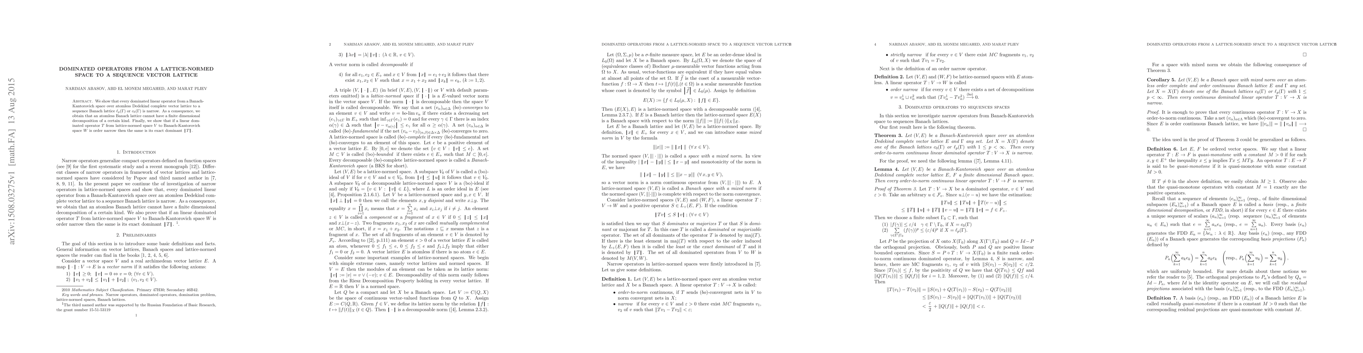 We show that every dominated linear operator from an Banach-Kantorovich space over atomless Dedekind complete vector lattice to a sequence Banach lattice $l_p({\Gamma})$ or $c_0({\Gamma})$ is narrow. As a conse- quence, we obtain that an atomless Banach lattice cannot have a finite dimensional decomposition of a certain kind. Finally we show that if a linear dominated operator T from lattice-normed space V to Banach- Kantorovich space W is order narrow then the same is its exact dominant $\ls T\rs$.