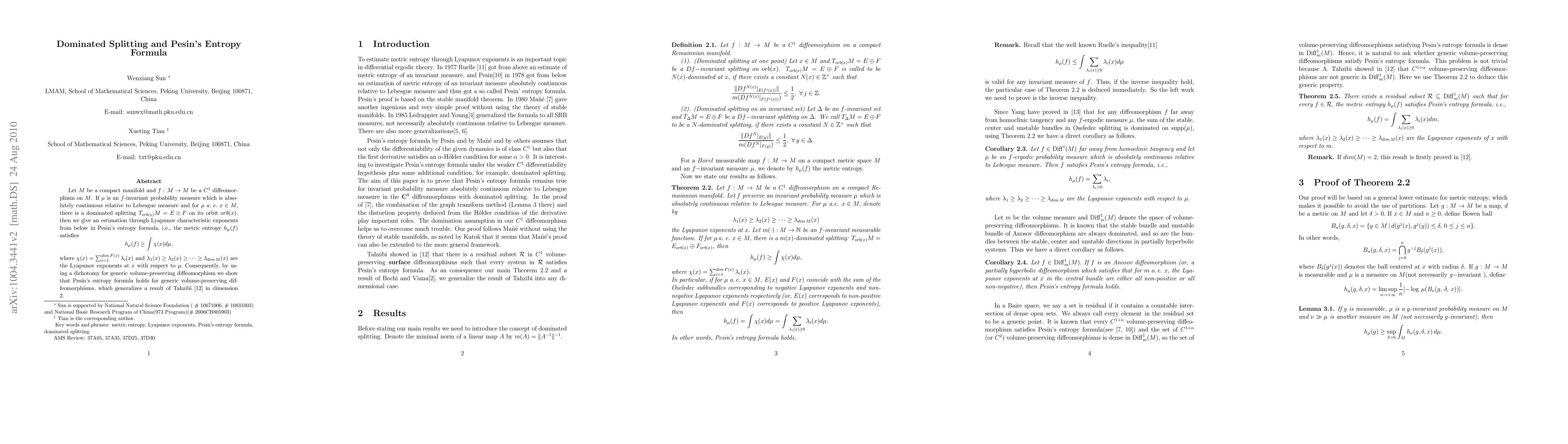 The novelty of this work lies in generalizing the applicability of Pesin's entropy formula to generic volume-preserving diffeomorphisms using dominated splitting, thereby expanding the scope of systems for which entropy estimates can be made.