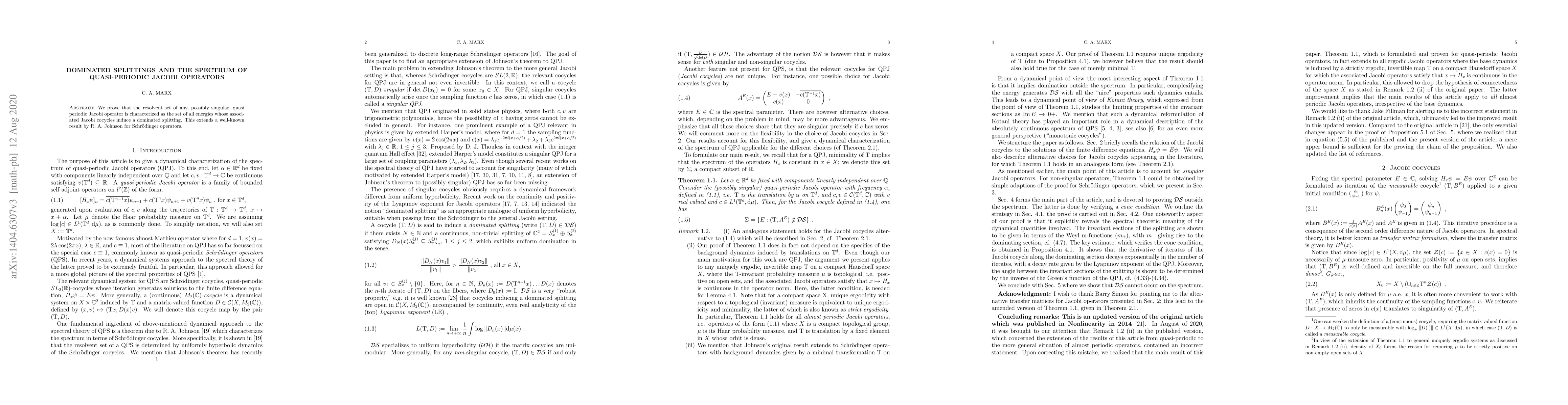 We prove that the resolvent set of any, possibly singular, quasi periodic Jacobi operator is characterized as the set of all energies whose associated Jacobi cocycles induce a dominated splitting. This extends a well-known result by R. A. Johnson for Schr\"odinger operators.