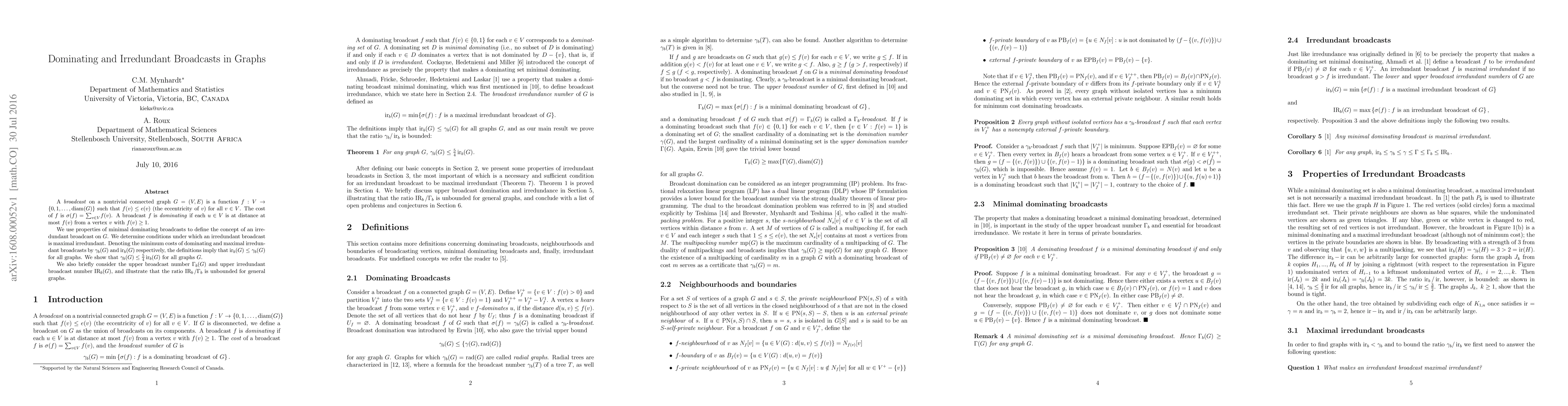 A broadcast on a nontrivial connected graph G=(V,E) is a function f from V(G) to {0,1,...,diam(G)} such that f(v) does not exceed the eccentricity of v. The cost of f is the sum of the function values. A broadcast f is dominating if each vertex of G is at distance at most f(v) from a vertex v with positive f(v). We use properties of minimal dominating broadcasts to define the concept of an irredundant broadcast on G. We determine conditions under which an irredundant broadcast is maximal irredundant. Denoting the minimum costs of dominating and maximal irredundant broadcasts by gamma_{b}(G) and ir_{b}(G) respectively, the definitions imply that ir_{b}(G) is bounded above by gamma_{b}(G) for all graphs. We show that gamma_{b} in turn is bounded above by (5/4)ir_{b}(G) for all graphs G. We also briefly consider the upper broadcast number Gamma_{b}(G) and upper irredundant broadcast number IR_{b}(G), and illustrate that the ratio IR_{b} to Gamma_{b} is unbounded for general graphs.