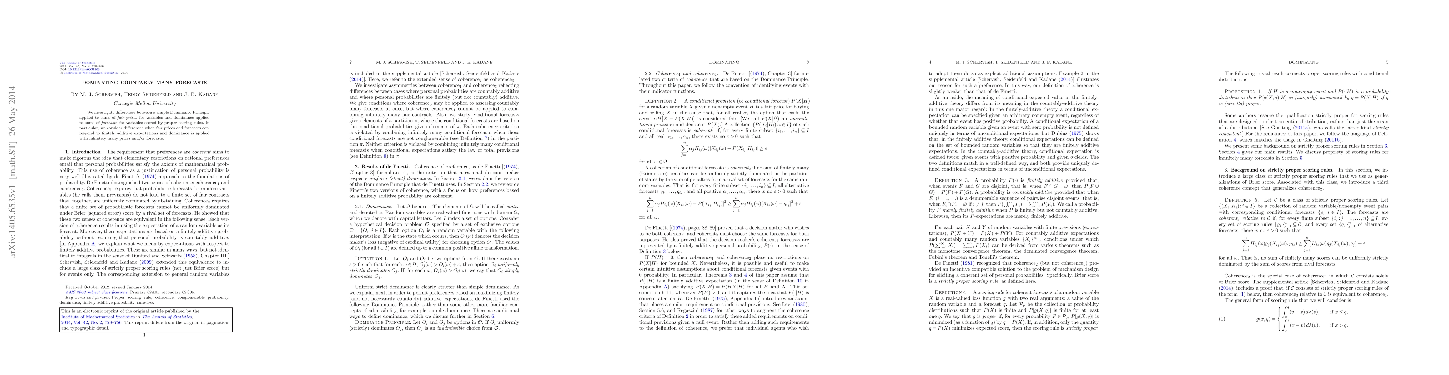 This paper compares two approaches to dominance: one for sums of fair prices and another for sums of forecasts scored by proper scoring rules. It finds that the forecasts approach can dominate even when there are countably many forecasts.
