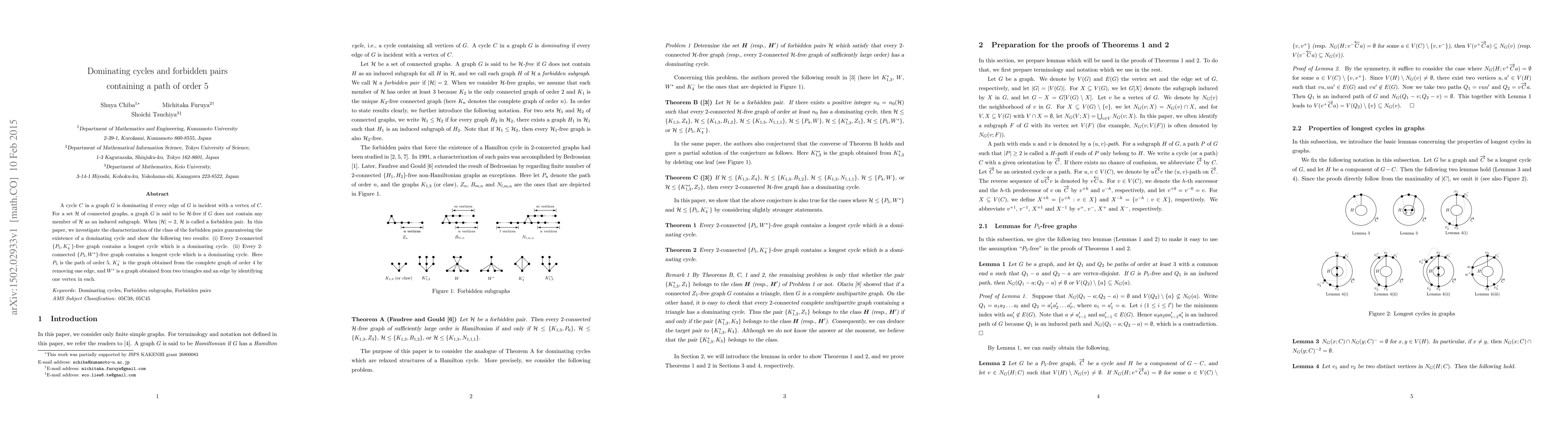 A graph contains a dominating cycle if every edge is incident with a vertex on the cycle. Researchers show that certain types of graphs (without path P5 or W*) contain a longest cycle which is also a dominating cycle.