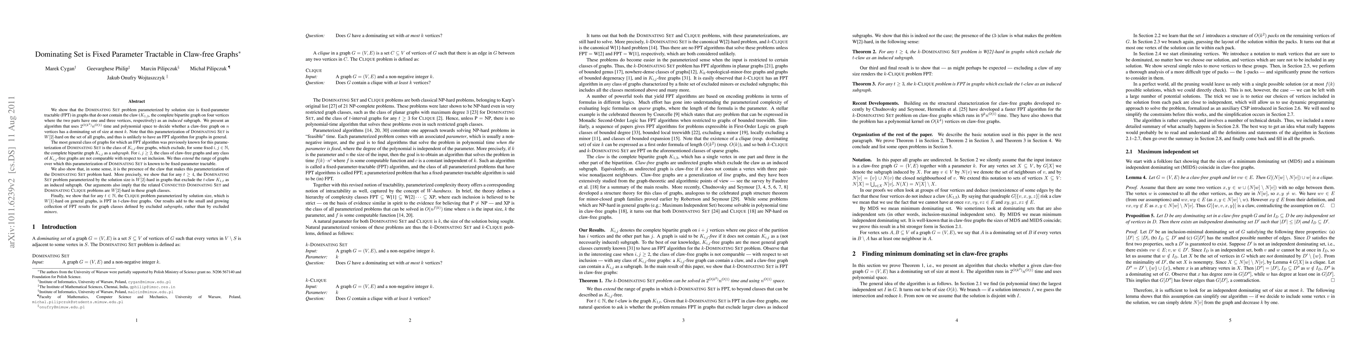 The paper demonstrates that the dominating set problem, parameterized by solution size, is fixed-parameter tractable (FPT) in claw-free graphs, extending previous FPT results to a broader class beyond K(i,j)-free graphs. The authors present an algorithm running in 2^O(k^2)n^O(1) time for determining the existence of a dominating set of size at most k in such graphs.