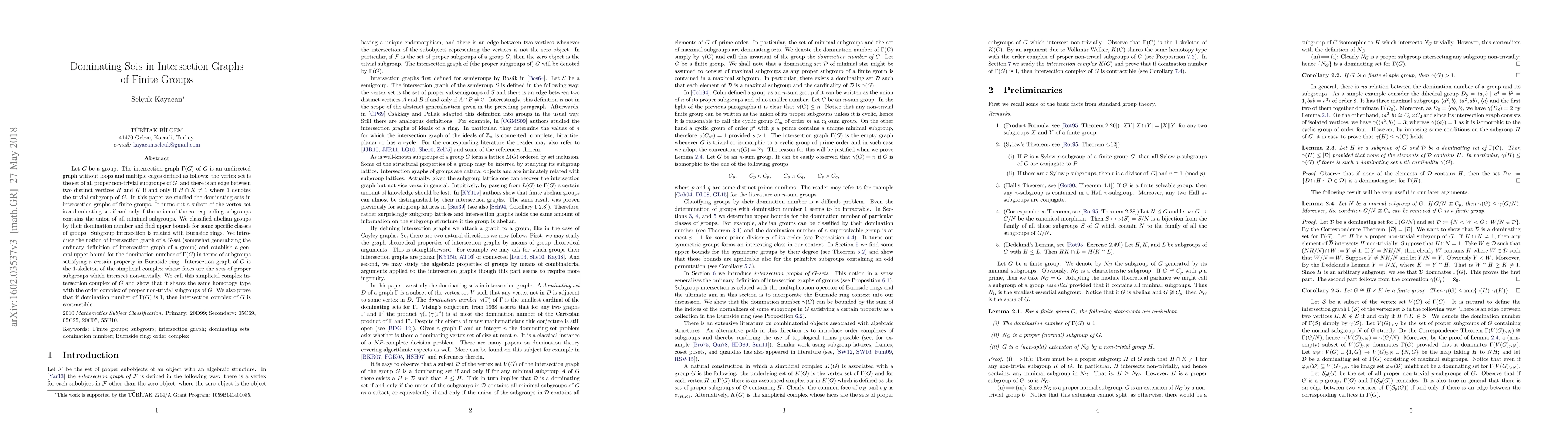 Let $G$ be a group. The intersection graph $\Gamma(G)$ of $G$ is an undirected graph without loops and multiple edges defined as follows: the vertex set is the set of all proper non-trivial subgroups of $G$, and there is an edge between two distinct vertices $H$ and $K$ if and only if $H\cap K \neq 1$ where $1$ denotes the trivial subgroup of $G$. In this paper we studied the dominating sets in intersection graphs of finite groups. It turns out a subset of the vertex set is a dominating set if and only if the union of the corresponding subgroups contains the union of all minimal subgroups. We classified abelian groups by their domination number and find upper bounds for some specific classes of groups. Subgroup intersection is related with Burnside rings. We introduce the notion of intersection graph of a $G$-set (somewhat generalizing the ordinary definition of intersection graph of a group) and establish a general upper bound for the domination number of $\Gamma(G)$ in terms of subgroups satisfying a certain property in Burnside ring. Intersection graph of $G$ is the $1$-skeleton of the simplicial complex whose faces are the sets of proper subgroups which intersect non-trivially. We call this simplicial complex intersection complex of $G$ and show that it shares the same homotopy type with the order complex of proper non-trivial subgroups of $G$. We also prove that if domination number of $\Gamma(G)$ is $1$, then intersection complex of $G$ is contractible.