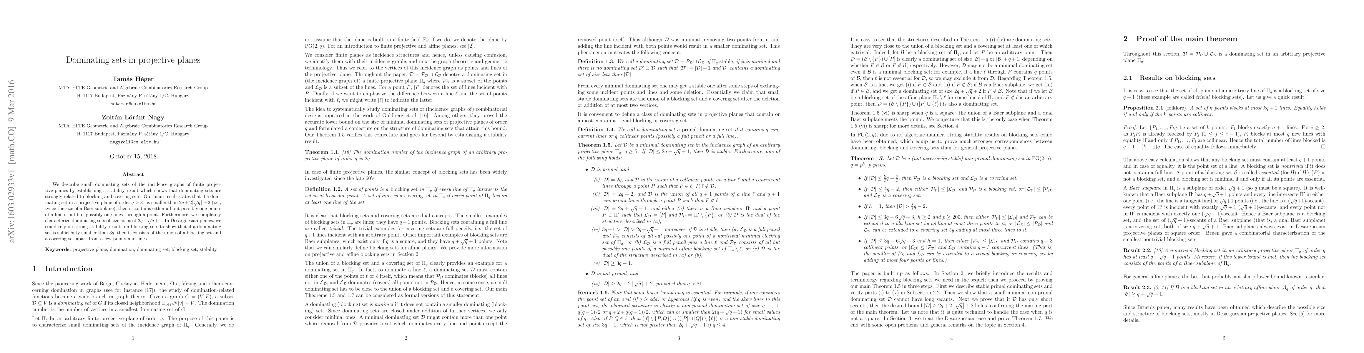 This paper investigates small dominating sets in incidence graphs of finite projective planes, establishing a stability result linking these sets to blocking and covering sets. The authors show that for projective planes of order greater than 81, dominating sets significantly smaller than $2q+2[\sqrt{q}]+2$ must nearly cover all points or lines. They also fully characterize dominating sets of size up to $2q+\sqrt{q}+1$.
